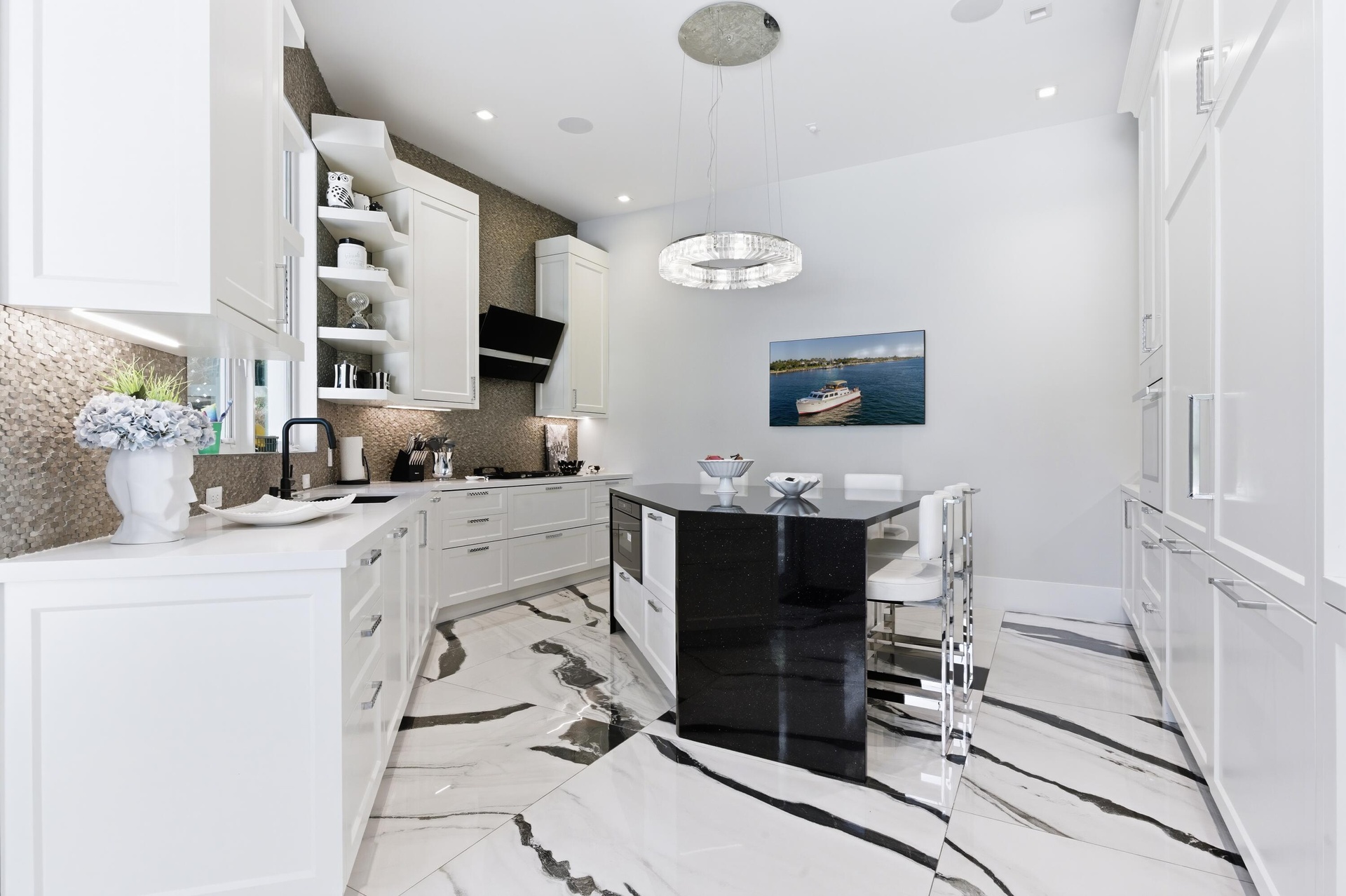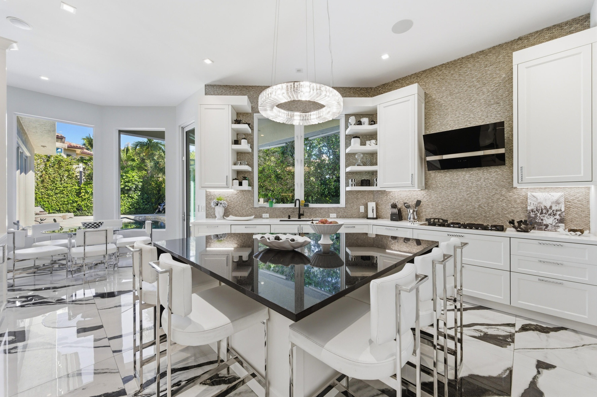 In-Town- Fabulous Southern Exposure Modern Mediterranean. This absolutely stunning, 5-bedroom, 5. 1-bath pool home has abundant light and was custom-renovated and reimagined for today's lifestyle. Fabulous home for entertaining with its open floor plan, 11.5 ceilings, library/den reinvented into a wine/bar opening to the pool with revolving wine display, wine cooler, and two icemakers. Fabulous eat-in kitchen, laundry room with dual Miele washers/dryers. It's all new, including the elevator, roof, impact windows/doors, flooring (marble/tile), a new pool deck/surface, a two-car garage with a lift for the 3rd car, and room for your golf cart too.