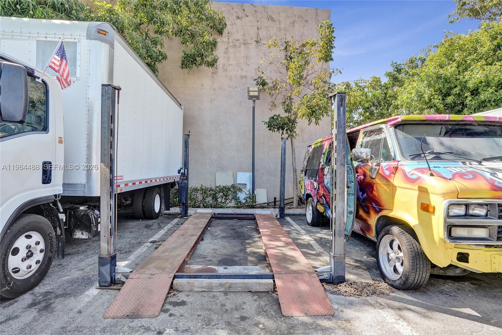 The property features approximately 1,000 square feet of functional office space, including two private offices and a garage. Designed with automotive operations in mind, the site offers two covered work areas suitable for servicing and detailing vehicles. A vehicle lift is also included in the sale, providing added value and turnkey capability for automotive users.