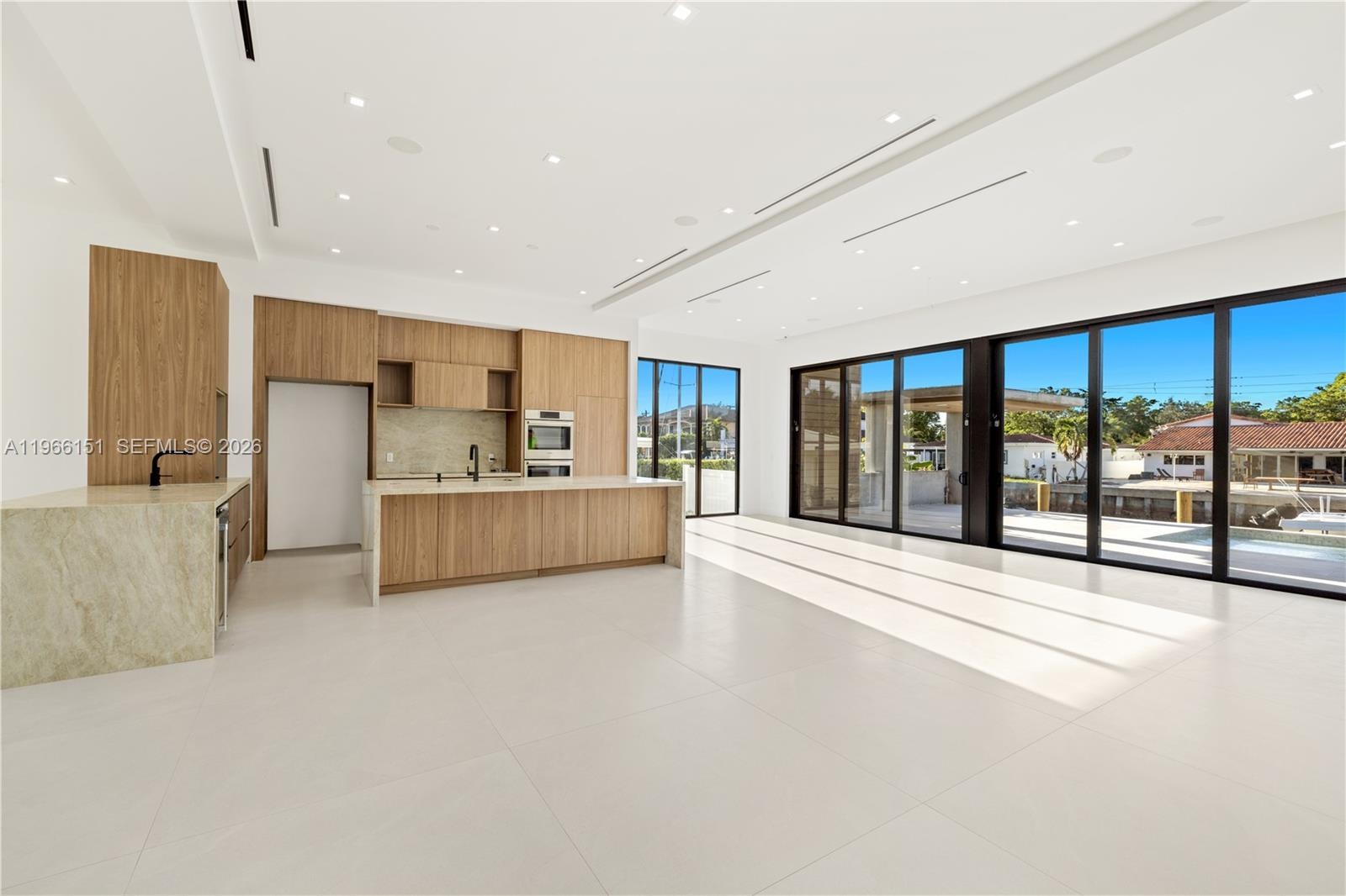 Hibiscus Drive Luxury Waterfront w/5118sqft under A/C residence in the guard-gated Keystone Point Islands with an 80’ dock, 50,000-lb boat lift, New seawall, and no fixed bridges to the open ocean. Completed in 2022 and impeccably maintained, this home offers 6 /5, including a primary suite on the first level and a second primary suite upstairs, provides flexibility for living and hosting.Bright open-concept interiors feature soaring ceilings, a custom wood staircase, a striking 48” Napoleon gas fireplace wrapped floor-to-ceiling in Taj Mahal stone with built-in cabinetry. Chef’s kitchen w/full Taj Mahal stone countertops, an oversized waterfall-edge island, Sub-Zero refrigerator/freezer, and a custom 3.5’ x 12’ L-shaped kitchen extension with prep sink, appliance cabinetry, double refrigerator drawers, and Perlick wine cooler. An elegant wet bar with addtl refrigeration enhances entertaining. Resort-style pool w/stone pool deck pavers and concrete pergola, and privacy landscaping. Boating amenities include the full-length 80’ TREX composite dock, 50,000-lb lift, and jet-ski davit, offering effortless access to Biscayne Bay and the open ocean.
