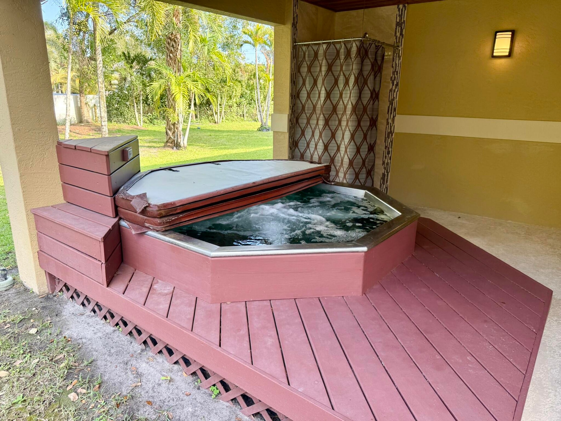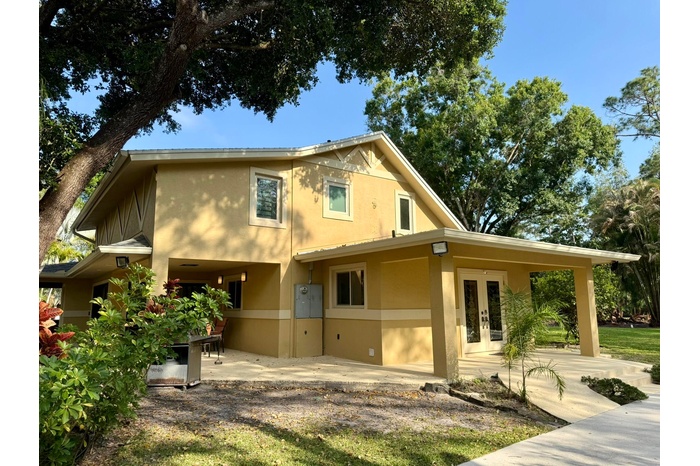 Rare, custom concrete, 2 building estate on paved roads in Jupiter Farms. This 2014 rebuilt, full CBS, steel-reinforced home offers unmatched durability with spray foam insulation and hurricane-impact windows. Situated on a high-elevation, gated, fully fenced lot with no HOA, there is ample space for RVs, boats, and equipment. The main home features soaring ceilings, oversized skylights, and a chef's kitchen with thick marble counters. Enjoy a primary spa-suite with a two-person granite shower. Outdoor highlights include a covered grill patio and a rare, maintenance-free 8-person built-in stainless hot tub. Detached 450 sq ft guest house (rebuilt 2023) features a private sauna. Includes 400-amp service, two gated driveways, and a 30 ft storage shed. Concrete filled, steel reinforced.