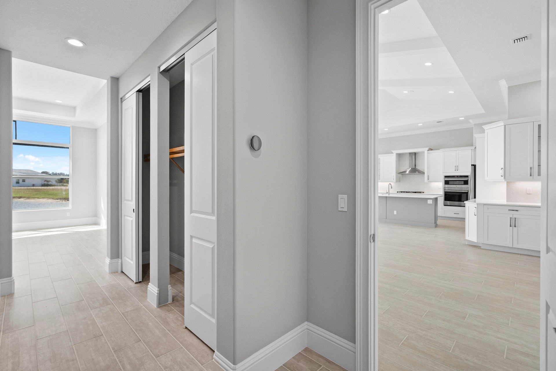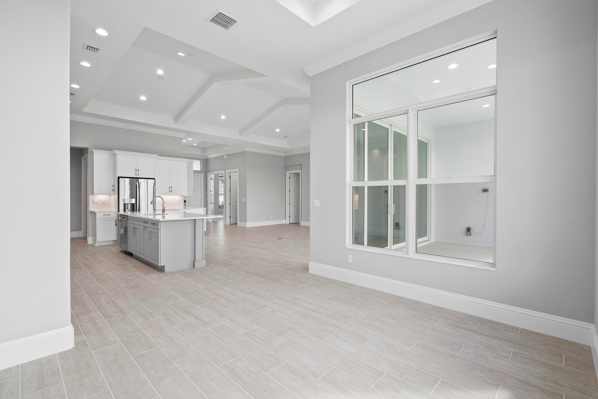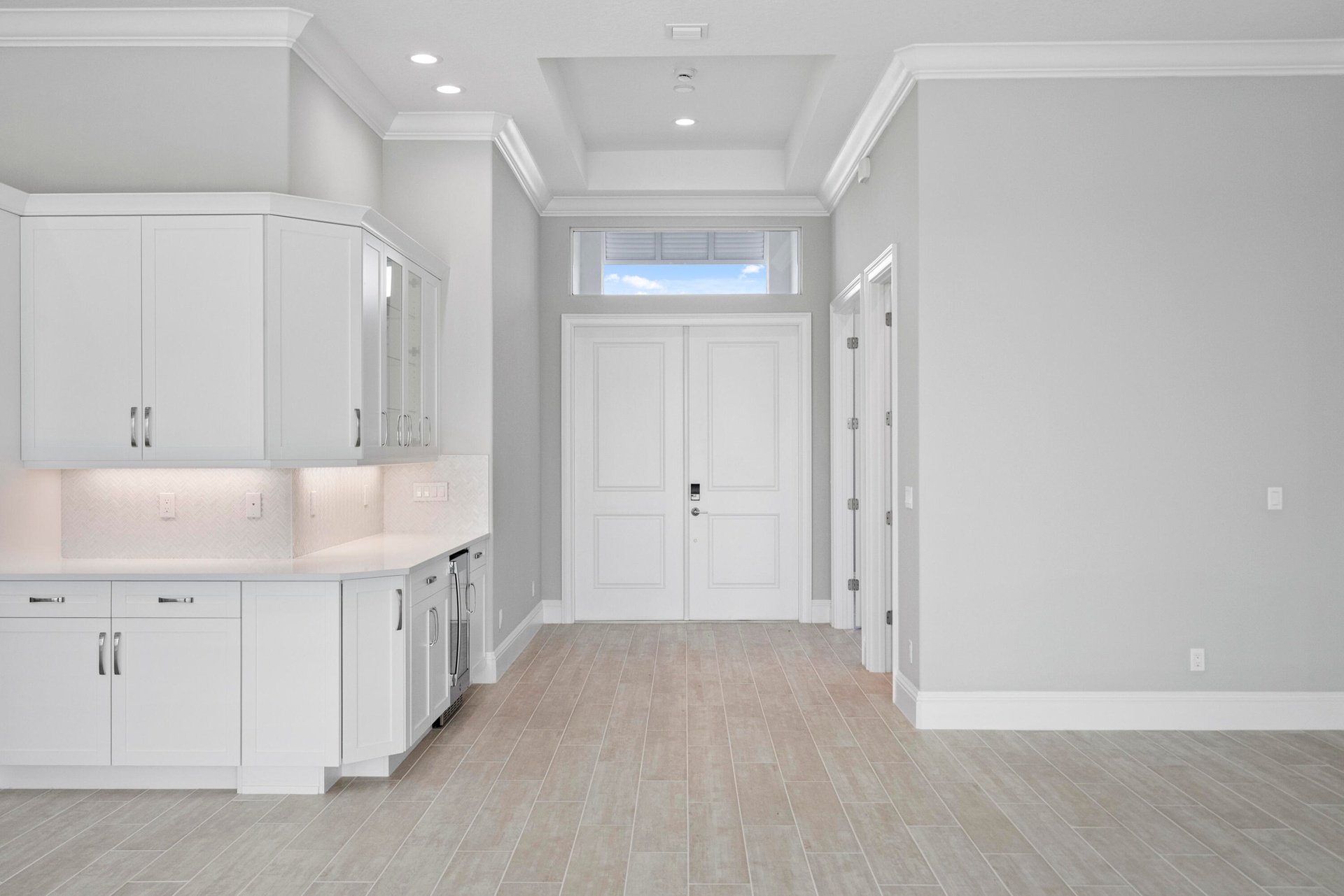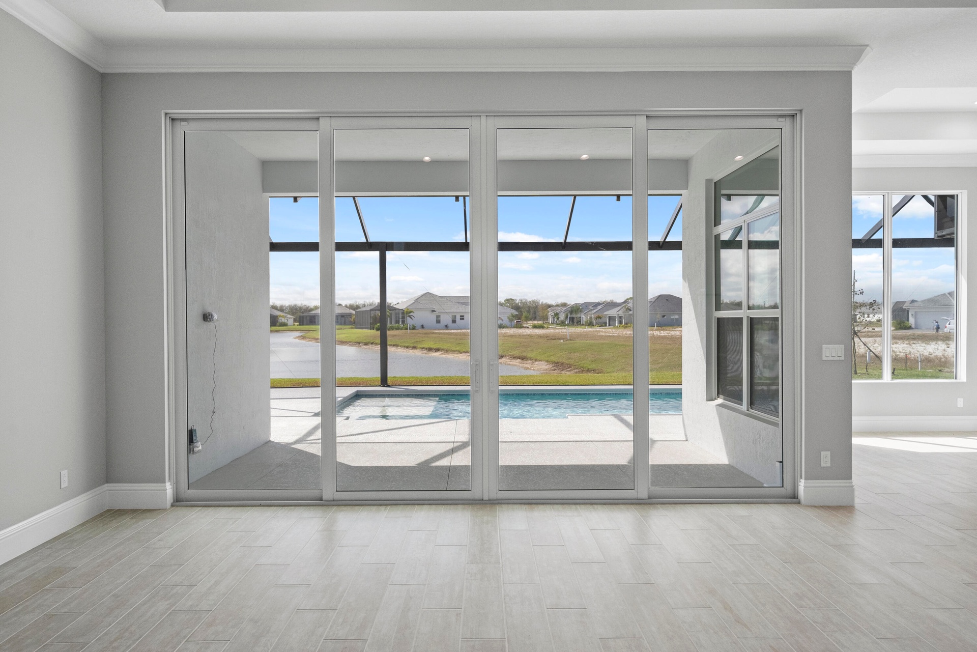 4 bedroom, 3.5 bath home with a den and 2-car garage showcases the elegant Coastal elevation and is thoughtfully designed with upscale finishes throughout. The heart of the home features a gourmet kitchen equipped with the GE Profile appliance package, upgraded quartz countertops, a Pelican single-bowl granite sink, and a kitchen convenience package for added functionality. The kitchen also includes two junction boxes above the island, ready for future pendant lighting, and opens to a spacious great room enhanced by 4 hi hats and a seamless flow into the dining room and office, all of which are also pre-lit. A bar with a built-in beverage center adds a touch of luxury and convenience for entertaining. The master suite is complete with an Aurelia free-standing soaking tub and spa-inspired finishes. Additional highlights include wood plank tile flooring throughout, tile-to-ceiling finishes in bathrooms 2 and 3, a pocket door for added privacy at bedroom 3, and prewiring for a wall-mounted TV on the covered patio. The home also features an enlarged pool with sun shelf, bubbler and panoramic screen enclosure, creating a private outdoor oasis with long lake views.