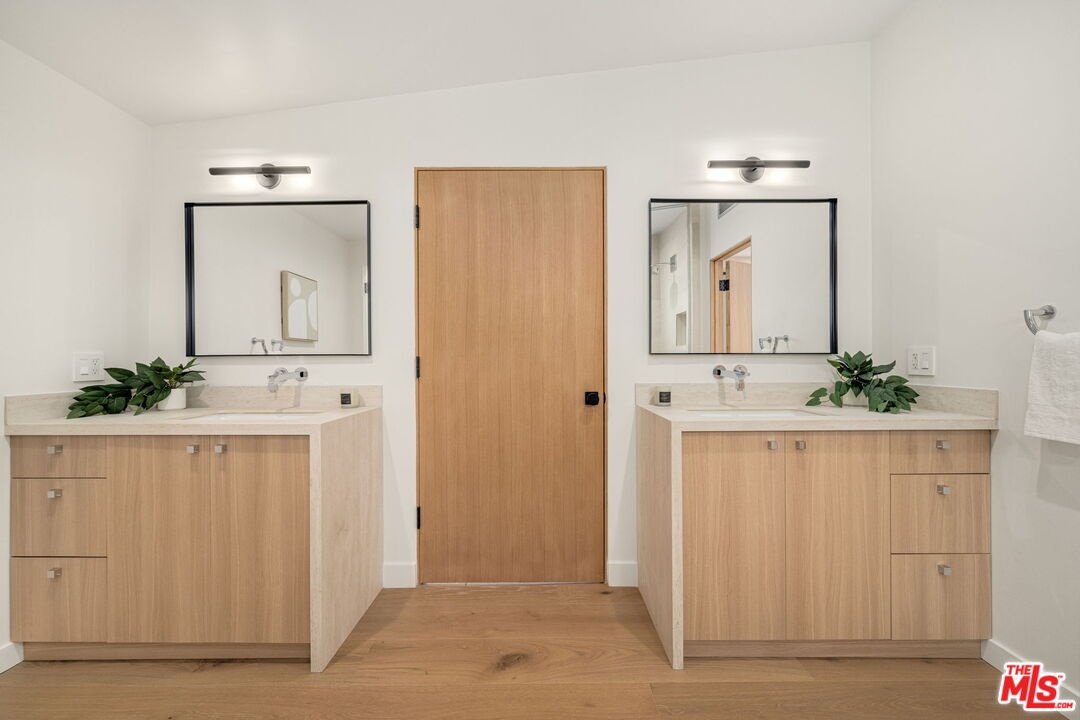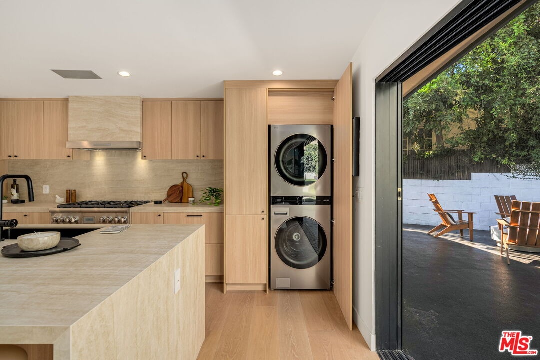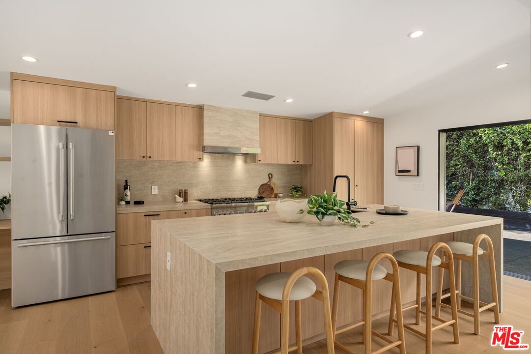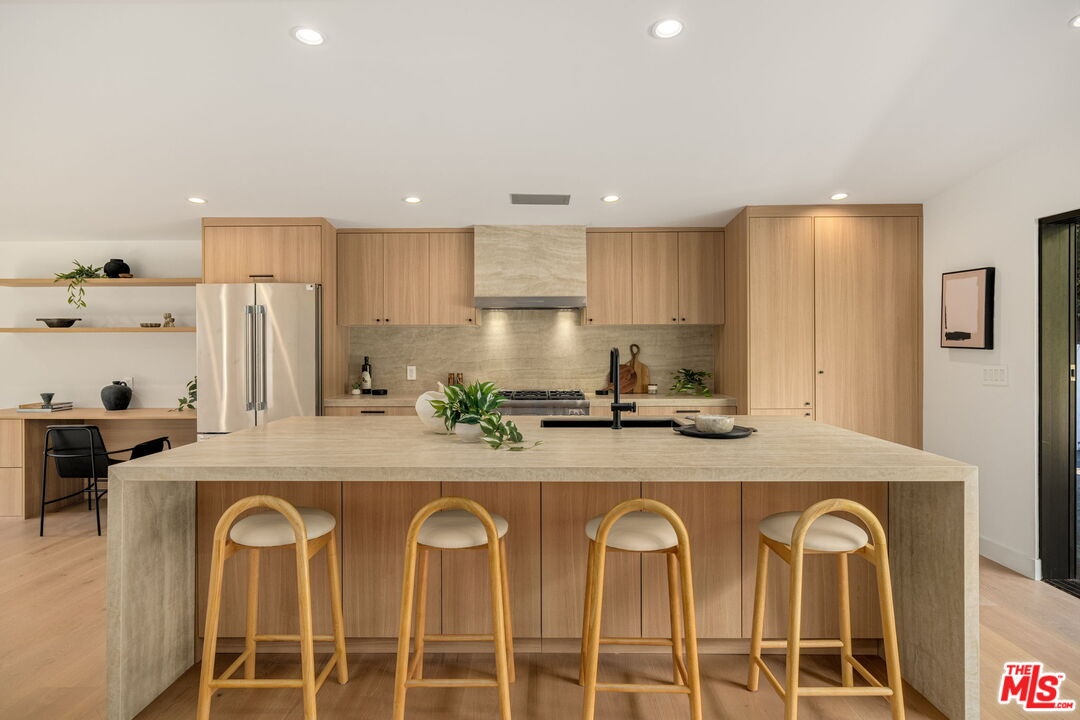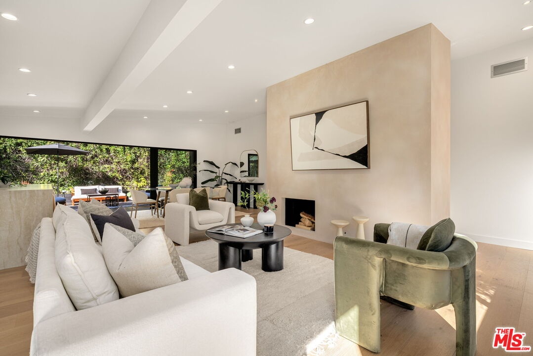 Introducing a rare ultra-luxury modern retreat in the Hollywood Hills, thoughtfully designed with no expense spared. This fully reimagined compound features a 2-bedroom, 2-bath main residence complemented by a separate, fully permitted 1-bedroom, 1-bath ADU offering exceptional privacy and versatility. Blending refined architecture, premium finishes, and seamless functionality, the property is designed for today's most discerning buyer. The main residence showcases meticulous craftsmanship throughout, highlighted by wide-plank Carrara hardwood flooring, hand-plastered detailing, and a dramatic plaster fireplace that anchors the living space. The designer kitchen serves as a true centerpiece, featuring custom cabinetry, an oversized island, honed Taj Mahal stone surfaces, and a full suite of high-end Thermador appliances, perfectly suited for both everyday living and elevated entertaining. Expansive sliding glass doors open on both sides of the space, creating effortless indoor-outdoor flow and an ideal setting for al fresco dining under the stars. Down the hall, spa-inspired bathrooms impress with custom plaster finishes, luxury stone countertops, and elevated hardware selections. Thoughtful details throughout the home include custom closets, surround sound, recessed lighting, and integrated climate features that enhance comfort and sophistication. The spacious primary suite offers a private outdoor retreat and a luxurious ensuite bathroom complete with a double vanity, a large walk-in shower with dual Axor shower heads, and a generously sized walk-in closet with custom lighting. The permitted 1-bedroom, 1-bath ADU features its own address and separate entrance delivers exceptional flexibility with a high-end kitchen, premium appliances, modern finishes that match the main residence, and a custom walk-in closet, making it ideal for rental income, guests, or a private office. Multiple outdoor spaces are designed for low-maintenance living and entertaining, featuring mature drought-tolerant landscaping, desert-inspired design elements, a sleek fire fit w a dedicated pre-plumbed gas line, an epoxy-finished concrete yard, and a large grassy area perfect for relaxation. Driveway with parking for three cars! Enhanced with modern security and smart entry features, this turnkey property offers luxury without compromise. A truly one-of-a-kind opportunity to own a private modern compound in the Hollywood Hills, offering exceptional quality, flexibility, income potential, and elevated Los Angeles living. This rare offering is not to be missed!