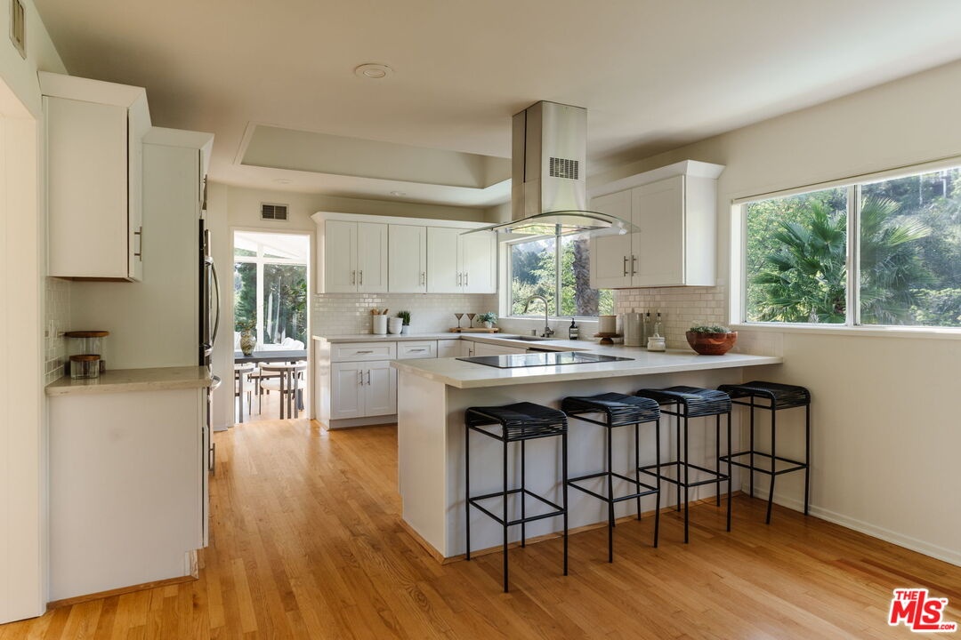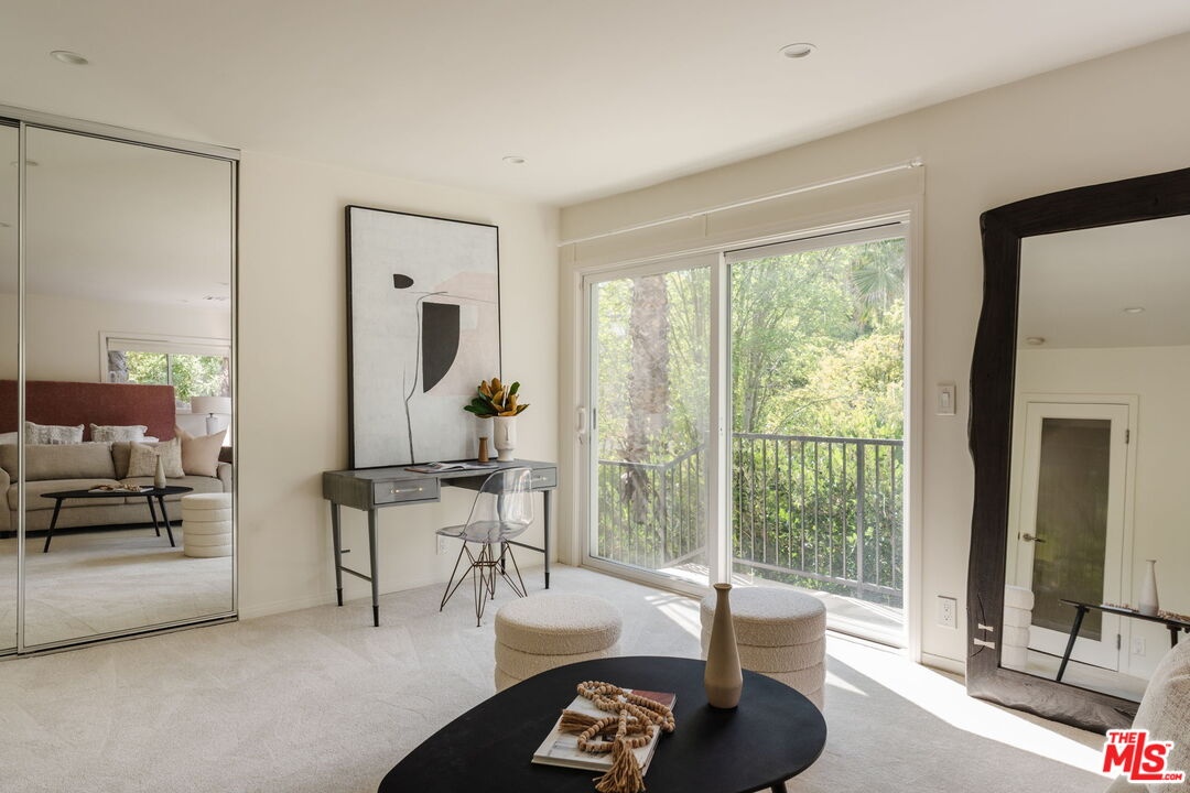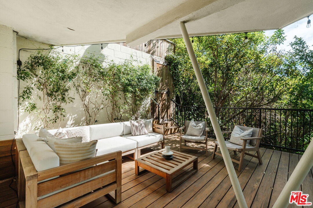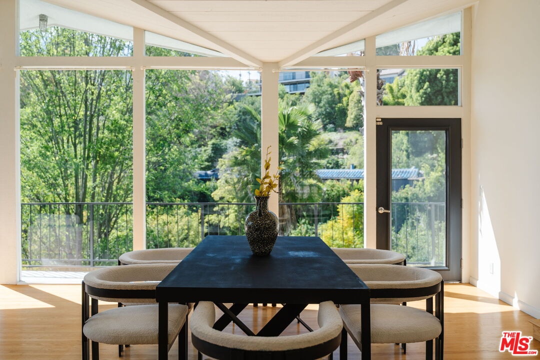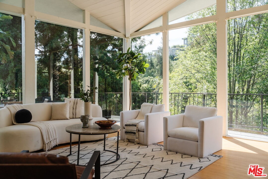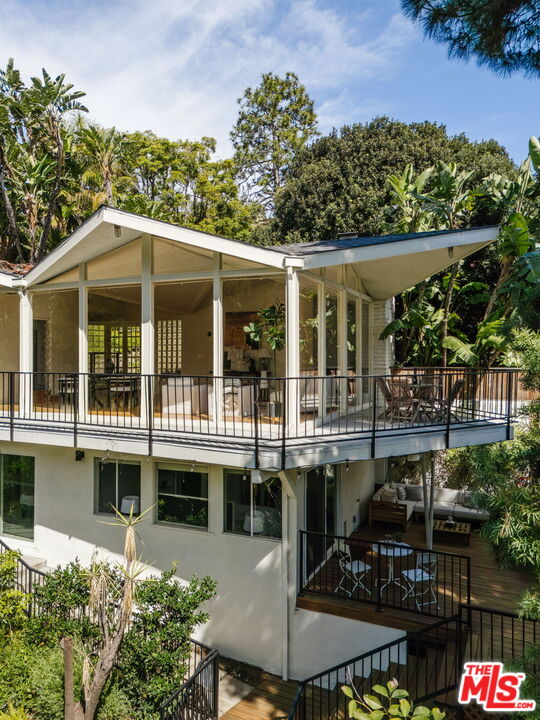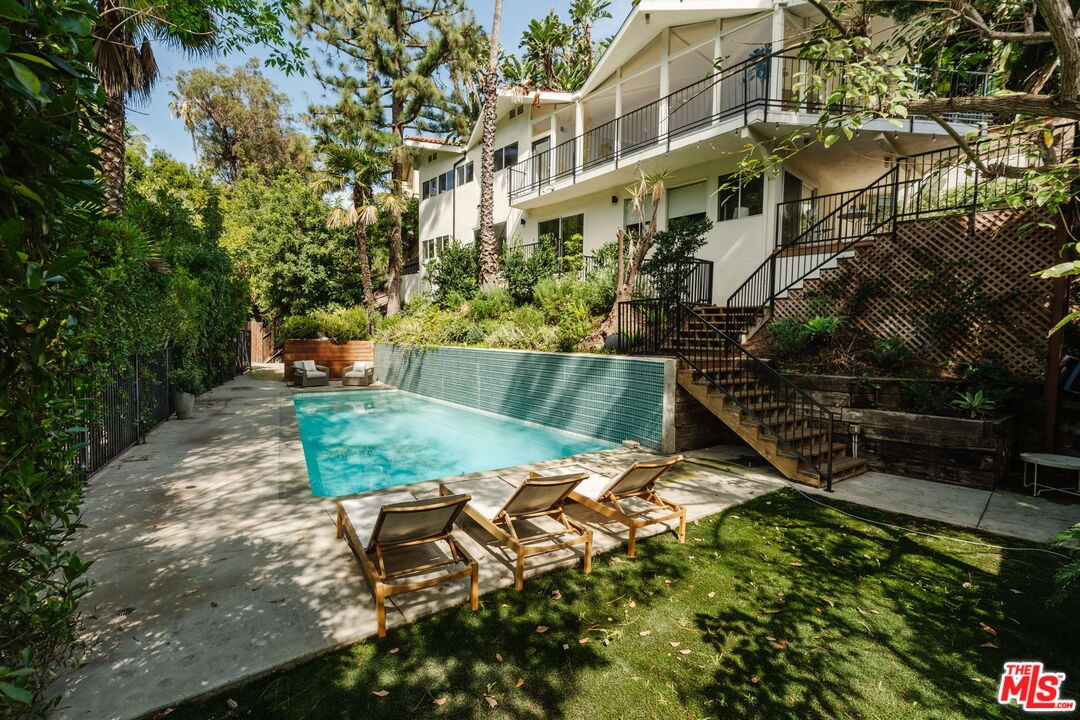 Privately set along a quiet road in sought-after Outpost Estates, this sophisticated mid-century home captures the essence of classic architecture paired with modern comfort. Framed by treetop surroundings and sparkling views that stretch to the downtown skyline, the home offers seamless indoor-outdoor living and a serene sense of retreat above the city. At the center of the home, the living room showcases a dramatic butterfly roofline and walls of floor-to-ceiling glass that flood the space with natural light while framing sweeping vistas. The open design creates an effortless flow for both daily living and entertaining. A sculptural floating staircase leads to the lower level, where three bedrooms, including two of which are oversized, provide privacy and comfort. The primary suite opens onto a spacious deck, which steps down to an inviting outdoor setting designed for relaxation and entertaining. The backyard features a sparkling pool, sun-filled lounging areas, and lush greenery that enhances the peaceful hillside setting. A thoughtfully remodeled kitchen, clean contemporary finishes, and a functional open layout complete the home, balancing timeless mid-century character with modern livability. Distinctive and memorable, this architectural retreat offers a rare opportunity to experience the tranquility of the Hollywood Hills while remaining moments from the energy of the city.