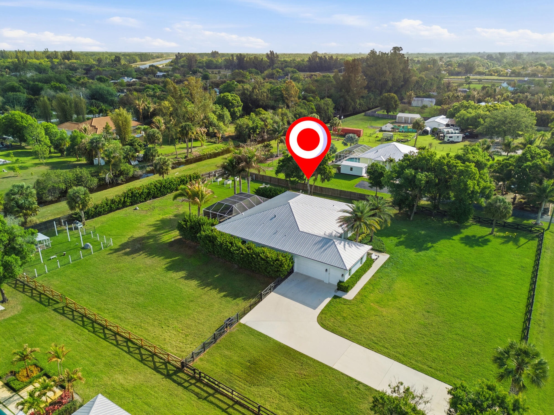 THIS WILL NOT LAST! Meticulously Upgraded! Lushly Landscaped 1.25 fully fenced acres in Jupiter Farms. Key West-style 2017 CBS home boasts impact windows and metal roof. Top of the line "platinum" whole-house reverse osmosis system, which also pumps into the pool. 2025 high-efficiency AC, 2024 pool pump and pool heater, 2023 panoramic pool enclosure. 2022 "Life Saver" child safety fence. The kitchen features solid wood dovetail cabinetry, quartz countertops, and a 64" Frigidaire Professional refrigerator. Other upgrades include Plantation shutters, designer lighting and fans, and custom wood shelving pantry. Professionally landscaped w/zoned irrigation, raised garden beds, and 2023 custom chicken coop. Canal access to 680 acre Riverbend Park to enjoy canoeing, fishing, equestrian trails.