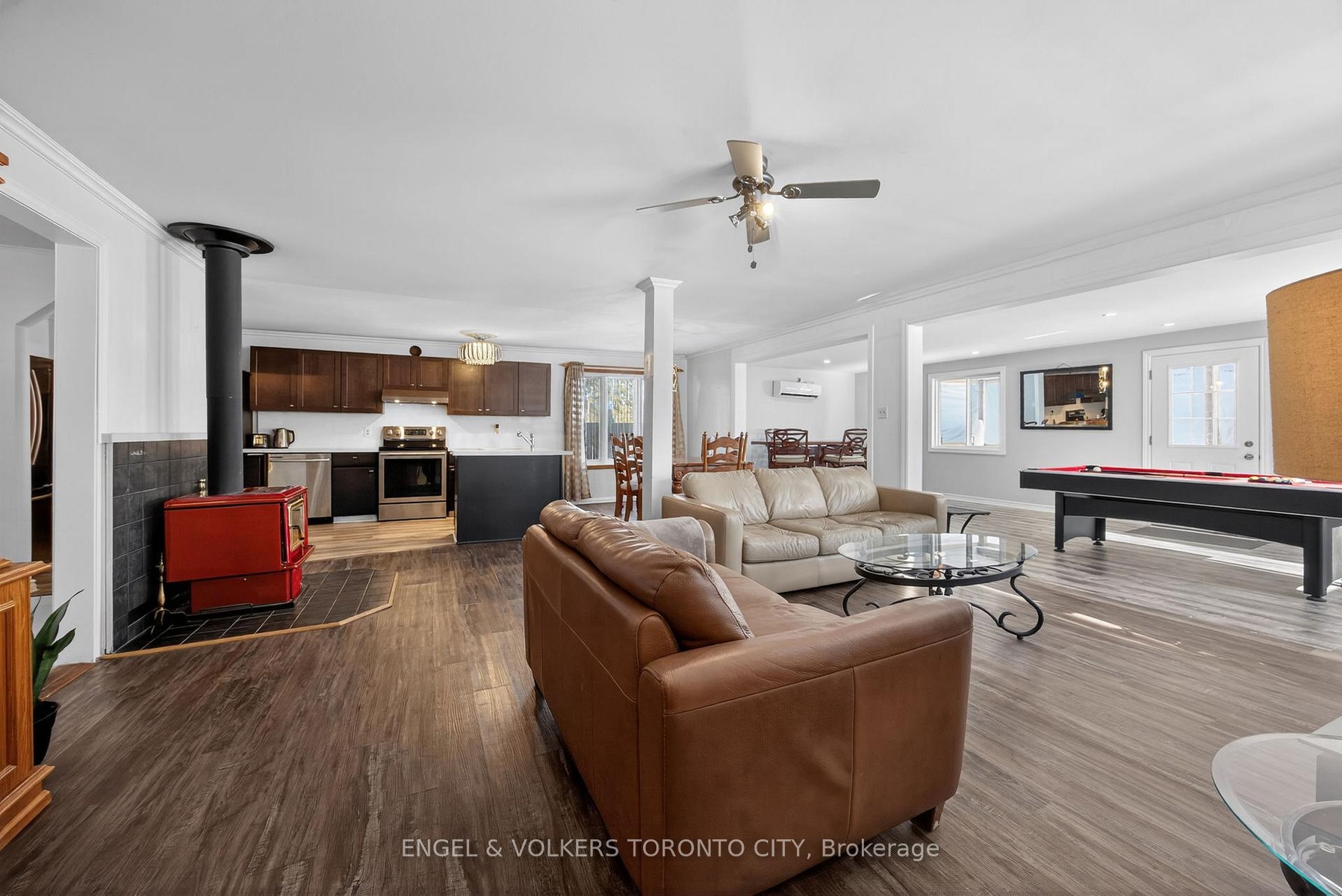 Welcome to your private riverfront escape along the Black River in Washago.This beautifully updated, fully furnished bungalow offers the perfect blend of comfort, style, and four-season living. A recent addition has expanded the main living space, now enhanced with 24 pot lights and consistent flooring throughout, creating a bright, open, and functional layout ideal for both everyday living and entertaining.The renovated kitchen features quartz countertops, stainless steel appliances, and a double sink, seamlessly connecting to the open-concept living area. Large windows fill the home with natural light, while a cozy wood-burning stove adds warmth and character.Step outside and experience what truly sets this property apart. The expansive covered deck overlooks the river, offering a seamless extension of your living space. Unwind in the barrel sauna, enjoy direct river access with a dock included, and take in the peaceful surroundings. Mature trees provide exceptional privacy, with no neighbours directly across the water.Additional features include a metal roof, municipal water, fibre internet, and ample parking with a carport, concrete pad, and oversized driveway.Conveniently located just minutes from Highway 11 and local amenities, this property offers the rare opportunity to enjoy a tranquil, nature-filled setting without sacrificing accessibility.Whether you're looking for a year-round home or the perfect weekend retreat, this is where cottage living meets everyday comfort.