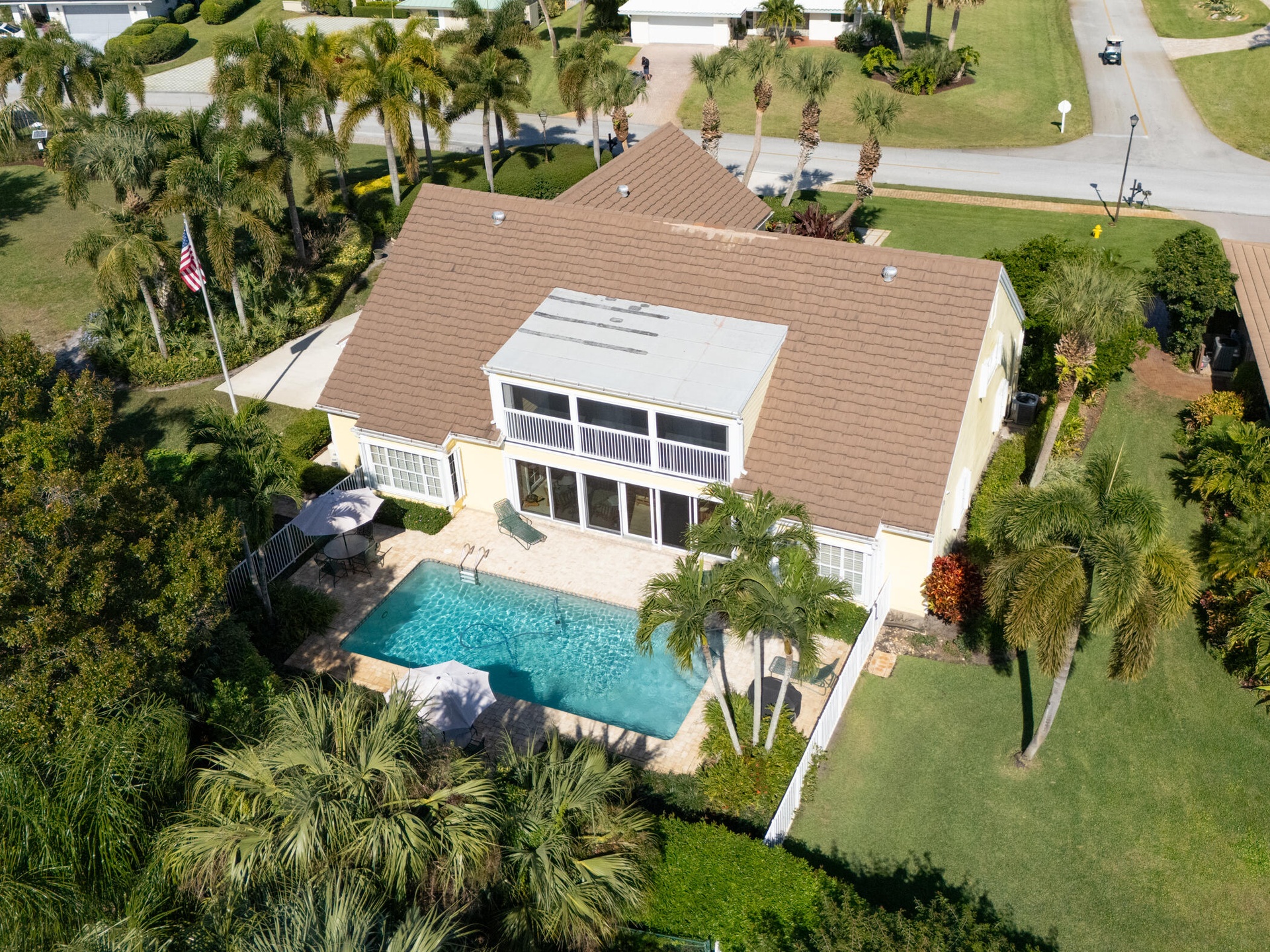 Welcome to the highly sought-after Yacht & Country Club of Stuart! This well-maintained spacious grand two-story residence home encompasses 4,898 square feet of living space, situated on the 16th tee, featuring four Bedrooms and 5 and 1/2 Bathrooms. The main-level master suite is designed for luxury, offering expansive closet areas, separate ''his and her'' bathrooms, w/ direct access to an office/den with Hurricane French doors leading out to the enclosed patio area. The upper level includes two additional mirrored en-suites, each complete with double vanities and huge storage closets, ensuring comfortable, private accommodations for family and guests. A 3rd suite also offers private quarters, complete with private bathroom walk in closet and sitting area. This home is a landmark lot and property within YCC, featuring a private pool and a beautiful backyard area. The Living room is distinguished by magnificent vaulted ceilings, wood beams, Matching Casablanca Ceiling Fans and an abundance of windows and sliding glass doors that open directly to the pool area, creating a seamless indoor-outdoor living experience.