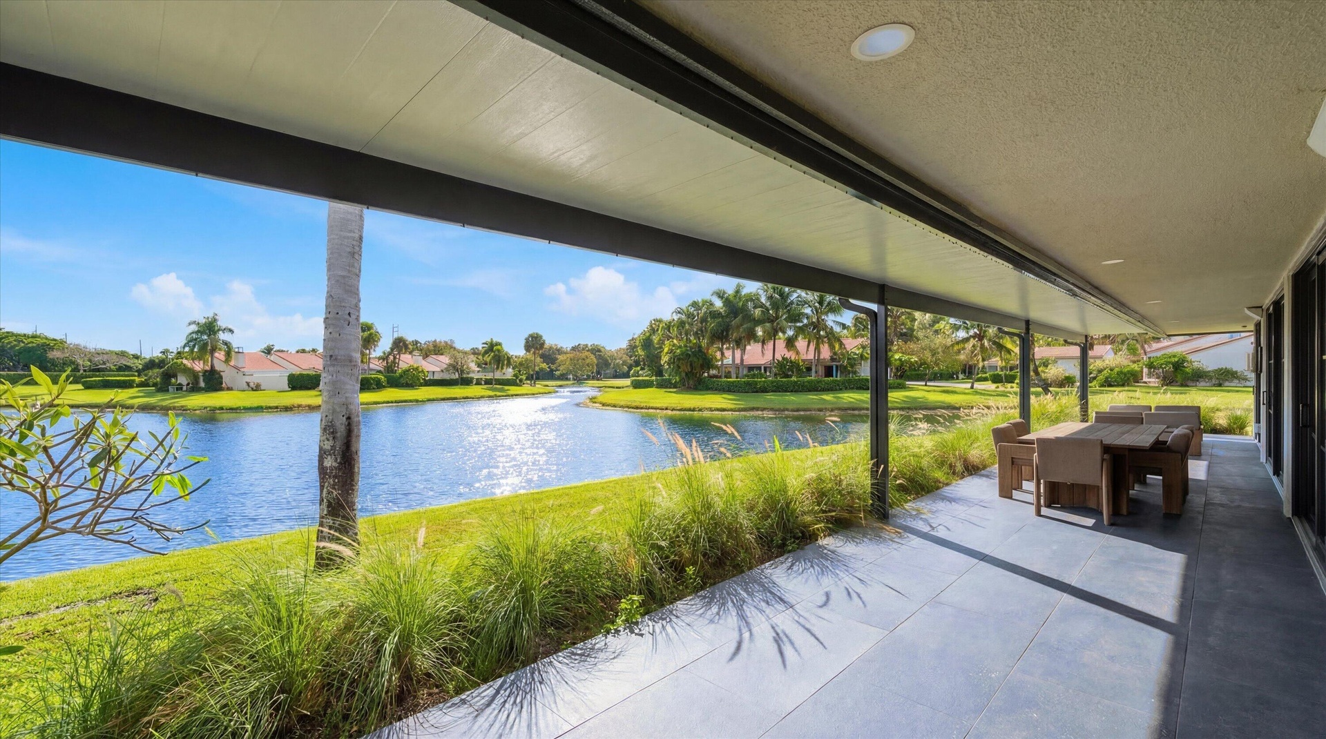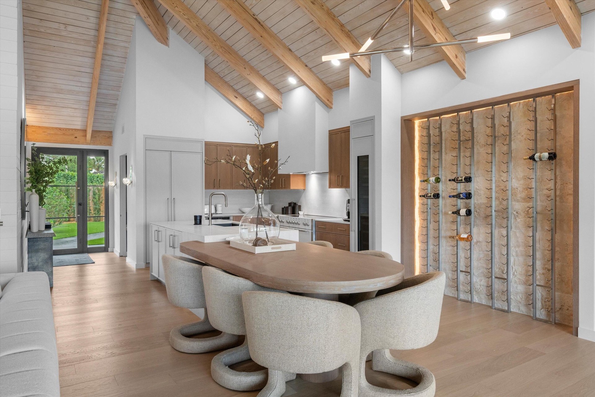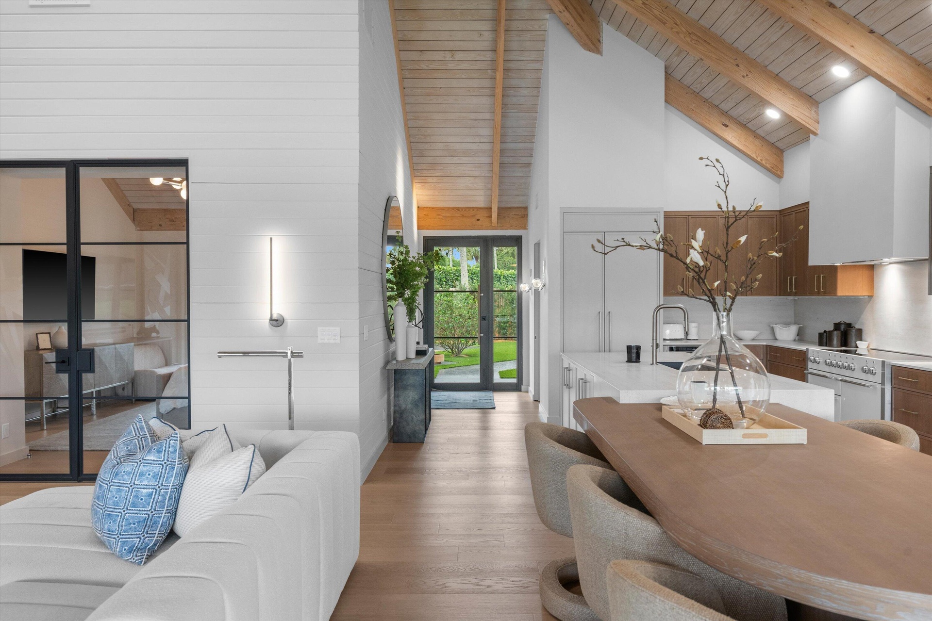 Tucked within the sought-after Palm Beach Polo community, this fully renovated 3-bedroom, 3-bathroom bungalow offers a refined blend of modern design and effortless indoor-outdoor living. Designed by Soco Interiors and offered fully furnished, the home is move-in ready with a clean, cohesive aesthetic throughout. Vaulted wood-beamed ceilings create a warm architectural statement, while wide-plank flooring and soft neutral tones enhance the light-filled, open layout. The kitchen is both functional and beautifully finished, featuring custom cabinetry, premium appliances, and a generous island that flows into the main living area. Expansive sliders open to a covered patio with wide water views. Outdoors, a private pool and thoughtfully landscaped grounds create a polished, low-maintenance setting. Additional highlights include a one-car garage and a prime location within one of Wellington's most desirable communities, just moments from the equestrian venues, dining, and shopping.