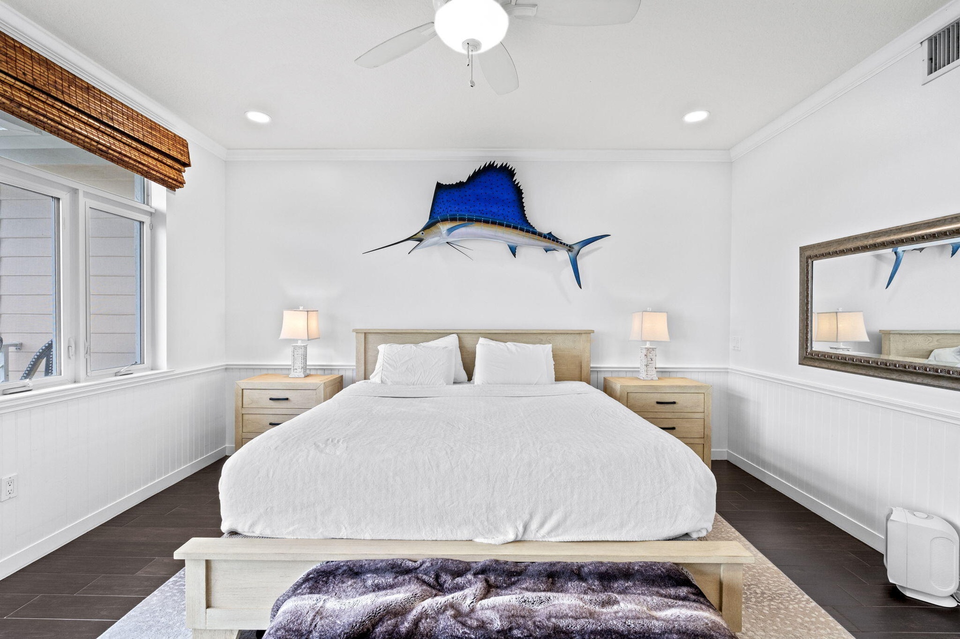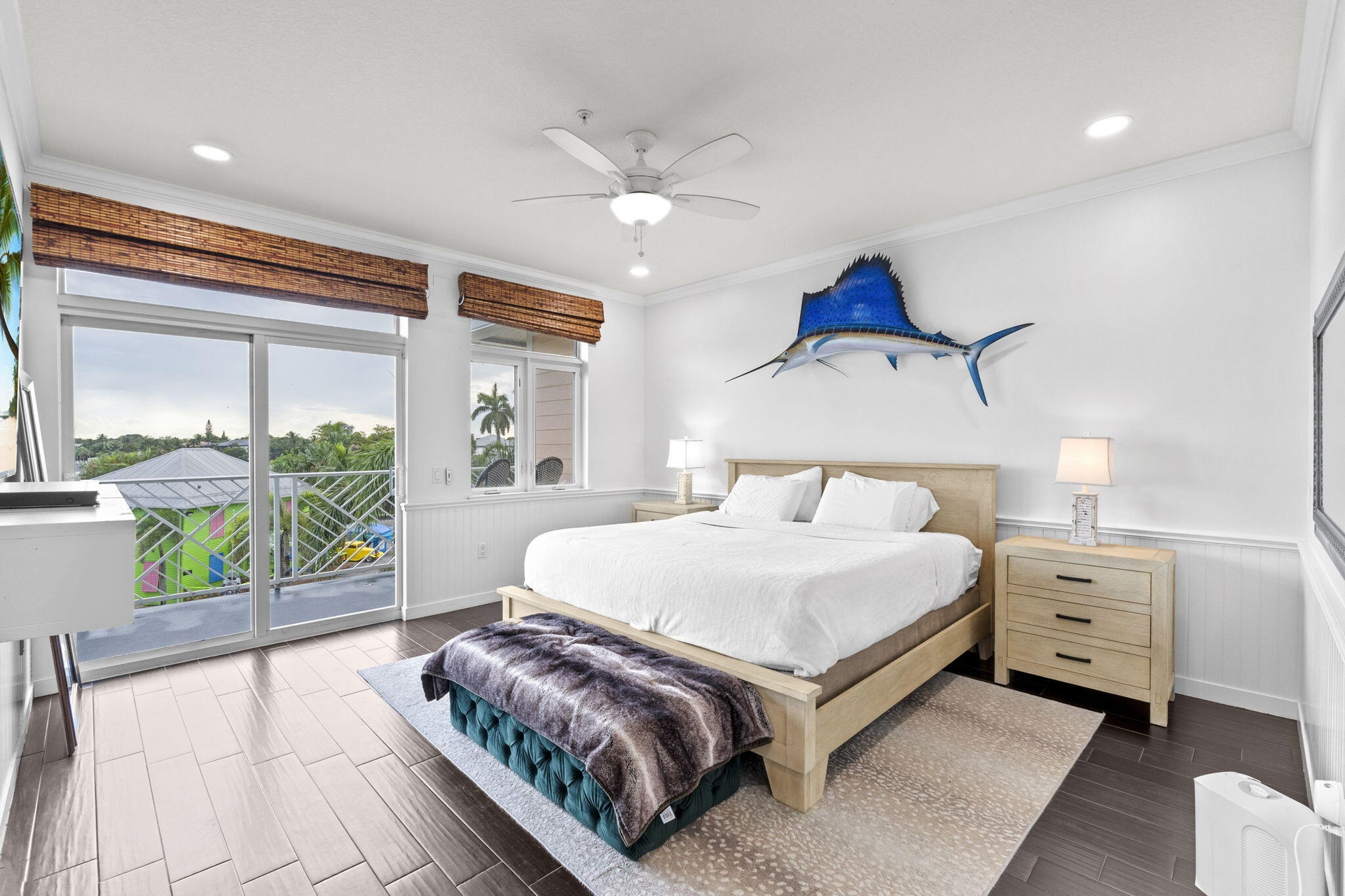 An open-concept floor plan features a generous kitchen with modern appliances and expansive living and dining areas. Intracoastal Waterway views are enjoyed from both floors, with two upstairs bedrooms offering serene water vistas and abundant natural light.