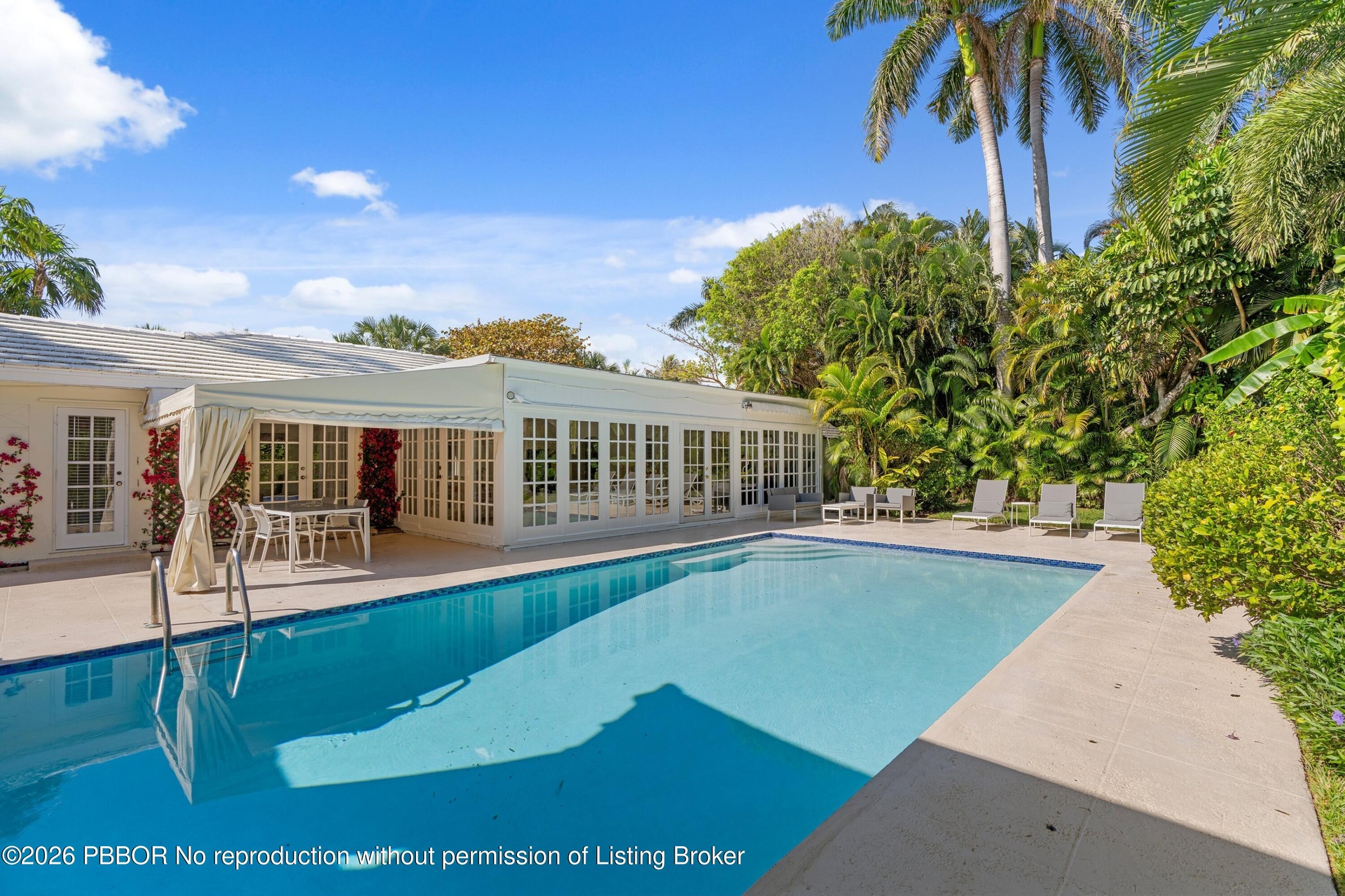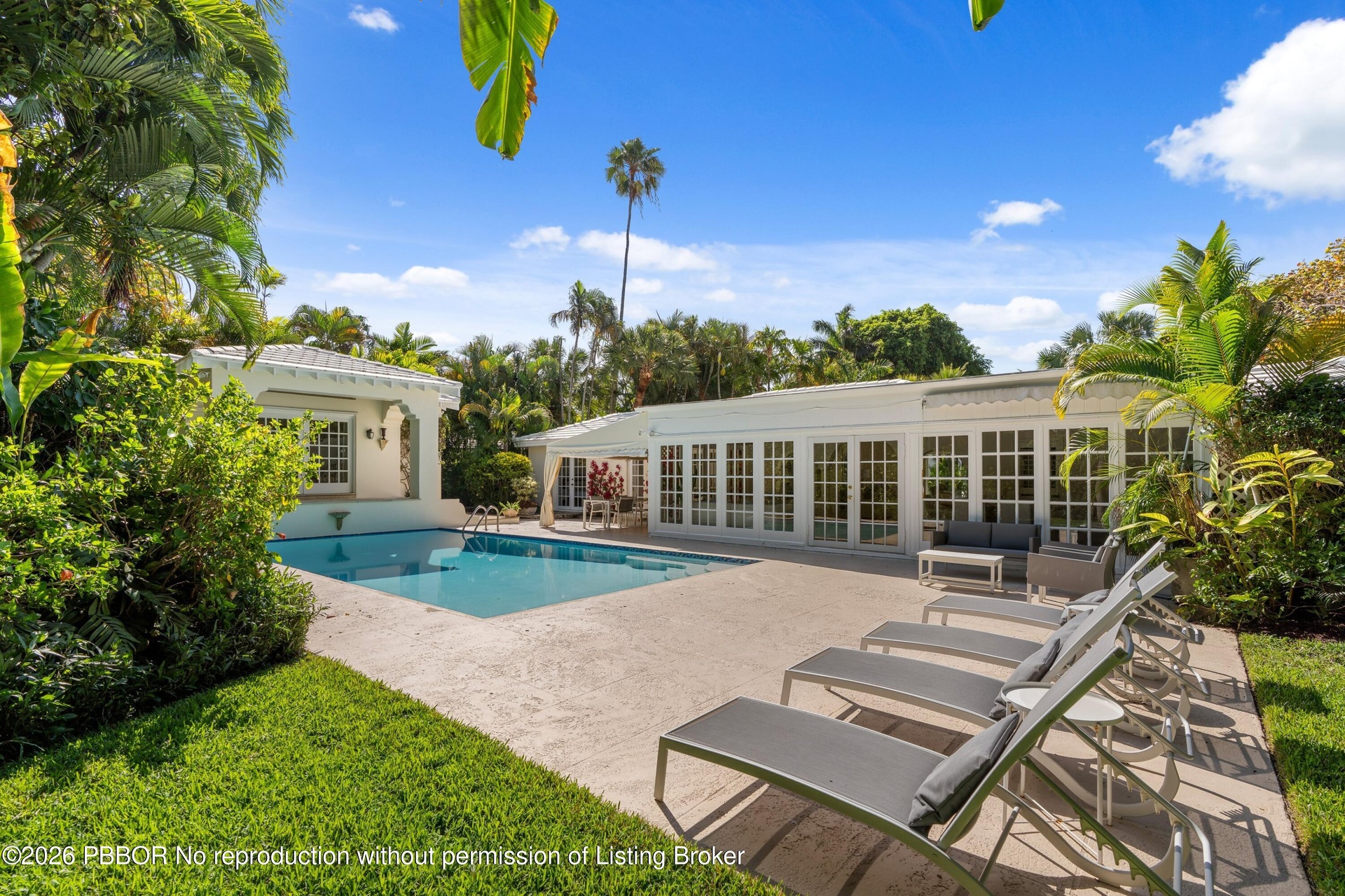 Nestled in one of the North End's most coveted neighborhoods, this charming Bermuda-style residence blends classic coastal style with relaxed living. Set on an expansive 11,500 SF lot, the property features a 3-bedroom main home, each with its own en-suite bath, plus a separate 1-bedroom, 1-bath pool house with kitchenette--ideal for guests or a private retreat. The lush backyard offers a sparkling pool surrounded by tropical landscaping, creating a serene, private oasis. Inside, generous living spaces flow to a welcoming loggia and covered patio for seamless indoor-outdoor living and entertaining. Enjoy easy beach access, scenic Intracoastal bike rides, and close proximity to top restaurants and shops--just minutes away. A rare opportunity to own in an exceptional location!