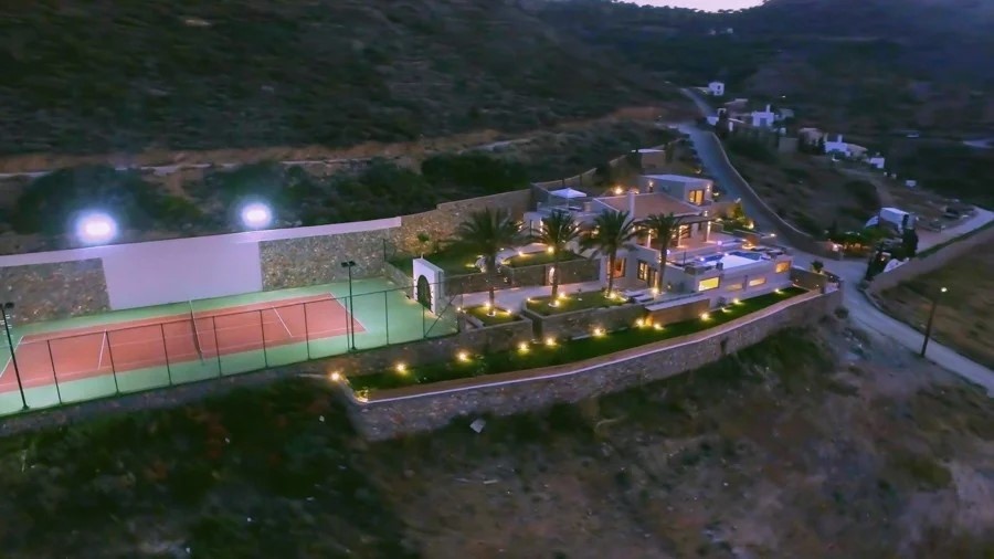 The villa is of 550 sqms and is built on a 2780 sqm plot, according to the highest standards of construction and with high-end fittings installed. It includes 5 bedrooms, 7 bathrooms, an office area, gym and sauna. The property has also a private tennis court with a 5-meter high hit-back wall, a 43-sqm pool and extensive, paved terraces.