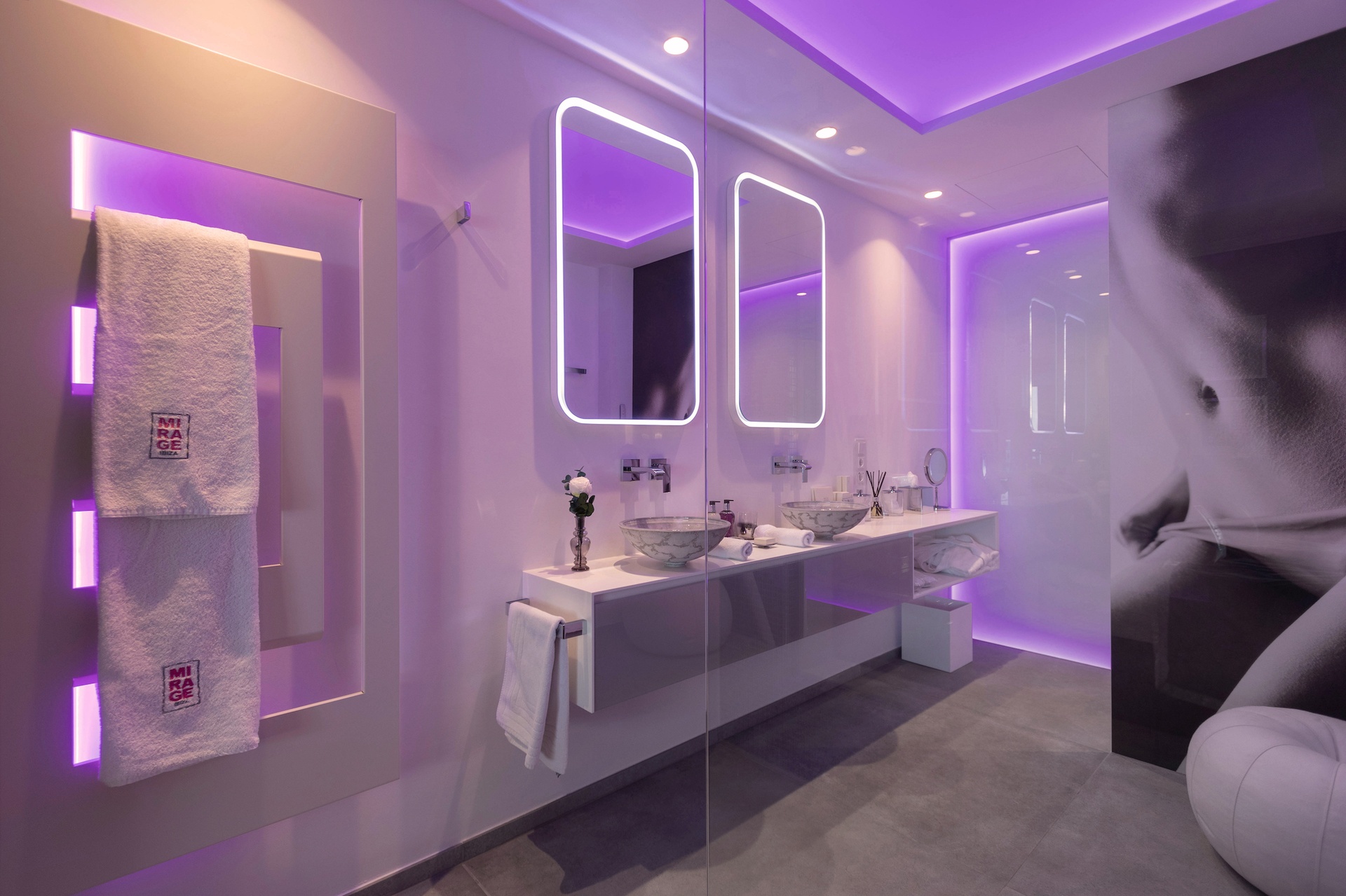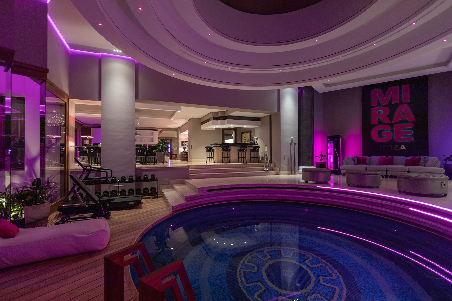 Private Beach Area: A bespoke outdoor beach zone featuring professional lounge beds, a private bar, and integrated LED screens.