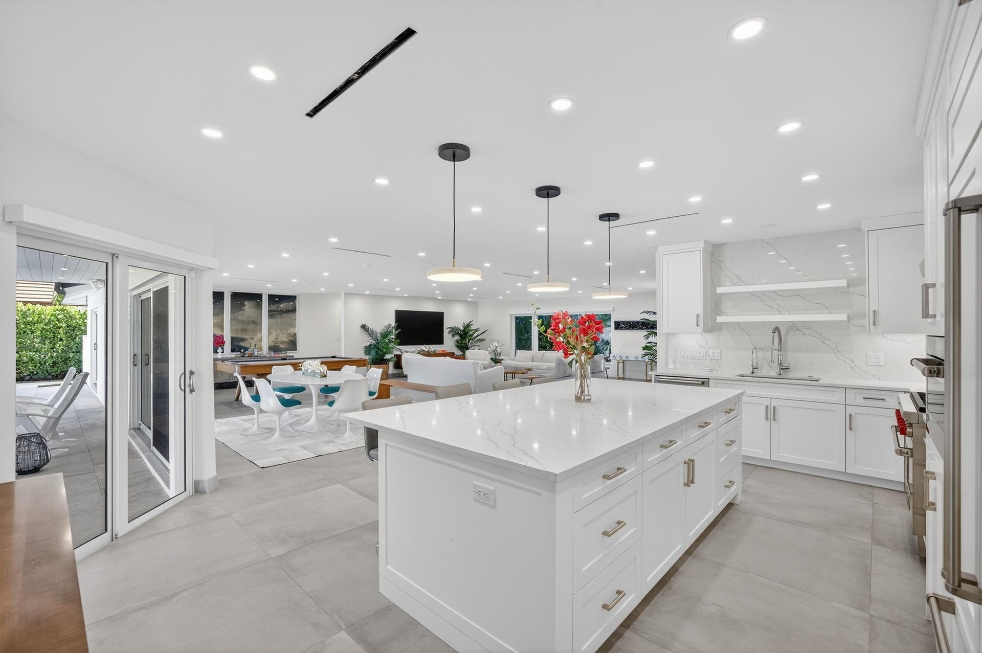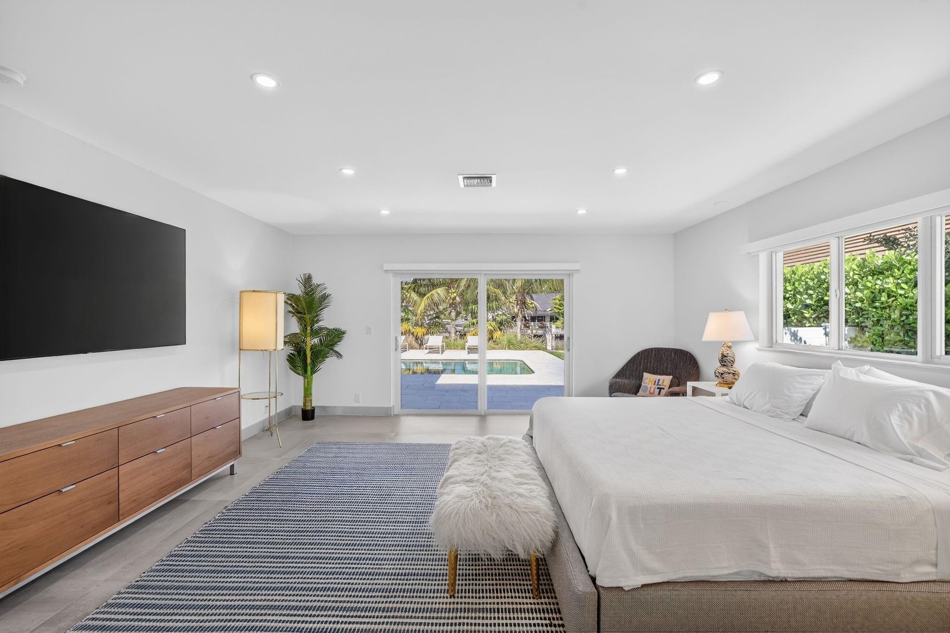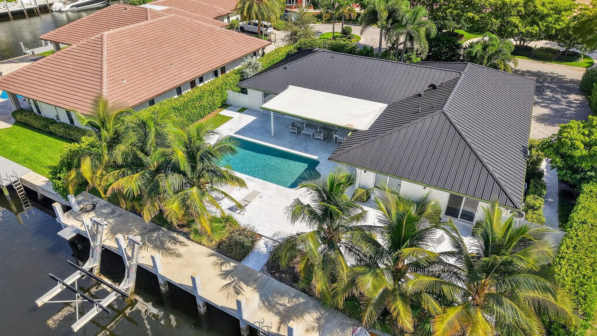Located in Fort Lauderdale's premier 24/7 armed security guard-gated deepwater community. Move-in ready & furnished for quick closing. Custom island-inspired single level residence. 2022 total renovation shows as NEW: metal roof, plumbing to street, all new electrical, air conditioners, tankless water heater & generator. Latest open concept living, great room, Chef's kitchen, porcelain tile floors, new impact glass & interior doors. Private Primary Suite, dual closets, new modern spa style bath, enclosed water closet, soaking tub & floating vanities. Split floorplan: 2 secondary bedroom suites, office (4th bed), cabana bath, air-conditioned garage. Most rooms access pool & wide-open radius turning basin views, 95ft protected dockage. Perfectly located for Pine Crest & other A rated schools Bay Colony features full time (24/7) armed security with only one guard house and access point. There are only 108 residences in Bay Colony as of this listing.2022 Custom Renovation (in addition to the above) includes:-Interior:* Large format porcelain tiles matching throughout the residence.* Mud-room/utility room with double LG washer and dryer systems and refrigerator, plus folding area and ample storage closets, desk area.* High-end plumbing features throughout include Porcelanosa and Toto* New interior doors & baseboards* Entirely new electrical service and custom lighting throughout the residence.* All new bathrooms with floating vanities and LED Mirrors.* Primary Suite: Separate custom closets, large spa style bathroom with enclosed water-closet, large shower and soaking tub. Window to exterior for natural light. Floating Italian style vanities with LED Mirrors & make-up area. Sliders to the pool area.* Entirely separate wing for the two secondary suites (both with new custom bathrooms) and home office (potential 4th bedroom). New cabana bathroom with exterior door to pool area.* Side access oversized air-conditioned garage with epoxy floors and large windows provide natural light. Currently doubles as gym.* Water softener* Tankless water heaterExterior:* Two Carrier Air Conditioners - 5 and 2 ton.* Circular driveway includes side access garage with parking for at least 6 cars on the side plus the circular driveway. All new pavers in the front and side pathways. New double entry front doors.* Fenced and gated rear backyard.* Fully renovated pool with marble pool decking and large covered terrace provides for outside dining and lounging.* Marble decking surrounds the entire pool area with large sunning area and separate area for firepit and grilling.* New docking with lighting and electrical service (boat lift excluded)* Professional landscaping throughout the entire property.24 KW Generator* New sea wall cap and dock