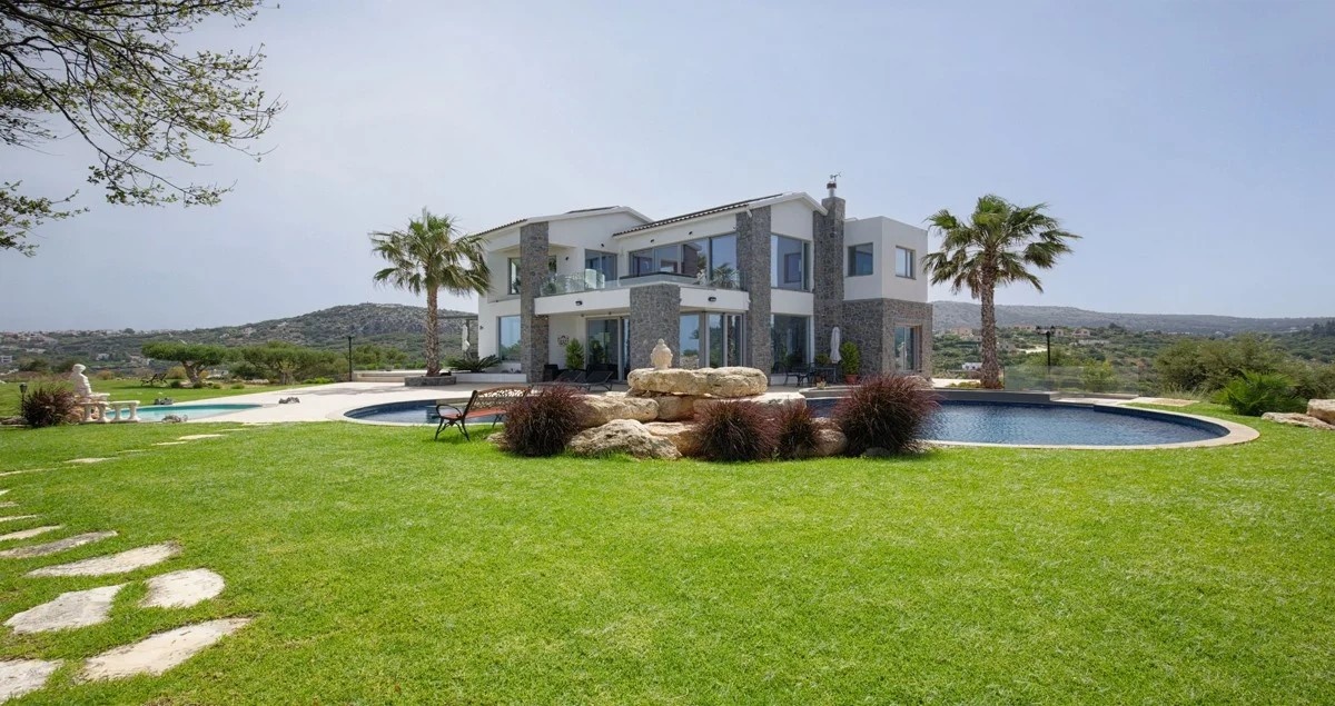 This luxury villa for sale in Apokoronas,Chania, Crete is located in Almyrida, offering 360-degree deep panoramic sea and mountain views. The villa has a total living space of 352m2, situated on a 4935m2 private plot. Meticulously developed over 3 levels, it consists of 5 bedrooms and 3 bathrooms. The groundfloor features a fully equipped kitchen, living room and dining room accompanied by a fireplace. From there, you can enjoy amazing sea views and direct access to the swimming pool and the BBQ area. All 5 bedrooms offer comfort and meticulous attention to detail. Upstairs, the master bedroom boasts a jacuzzi on a spacious balcony with breathtaking panoramic views. There is also a lavish basement below, offering generous storage space and features its own studio apartment. Also, the garage provides space for 2 cars, an electric gate and an electric car charger.
