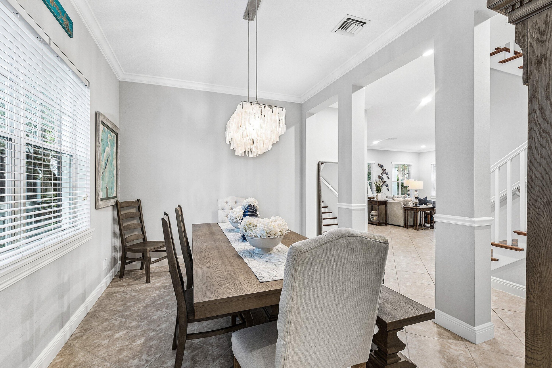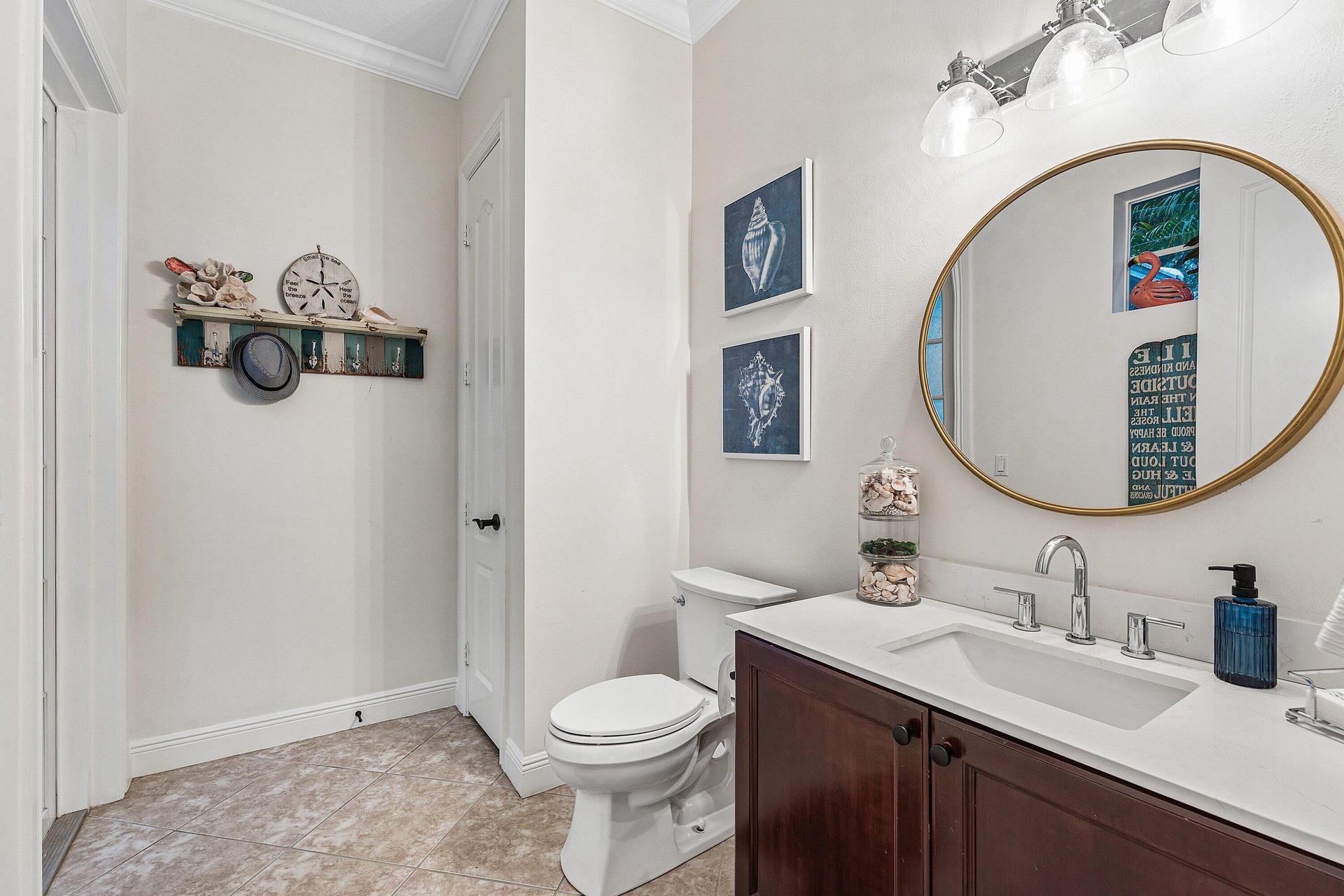Welcome to this beautifully appointed 5-bedroom CBS home on an oversized corner lot in Jupiter's coveted Botanica community. Over 3,300 square feet of living space features soaring 10-foot ceilings with crown molding, 8-foot interior doors, and porcelain tile floors throughout the lower level. The gourmet kitchen impresses with GE Profile stainless-steel appliances, a center island, breakfast area with bay-window overlooking the courtyard, and a butler's pantry with walk-in storage connecting to the formal dining room. The main floor also offers a cabana half bath, a spacious laundry room with a new GE Profile washer and dryer, and a den or 5th bedroom with an ensuite, built-in Murphy bed and full bath— perfect for guests or a home office. Upstairs is the primary suite & three guest ... bedrooms, two with private balconies and stunning sunset views over the preserve. At the heart of the home on a large corner lot you will find a lushly landscaped private courtyard with Chicago-brick pavers. Accessible via French doors throughout the first floor, this courtyard offers a covered patio and room for a private pool. The 3-car garage includes a Tesla Home Gateway with dual EV charging stations, and a Husky built-in storage system with ceiling racks. Additional features include dual A/C zones, a new water heater, full hurricane protection, a 6-camera security system, and exterior bistro lighting. Ideally situated across from the preserve and within walking distance to Publix and Starbucks, with easy access to pristine beaches, fine dining, A-rated schools, Love Street, Abacoa, FAU, Roger Dean Stadium, I-95, and PBIA. Furniture negotiable — truly move-in ready!