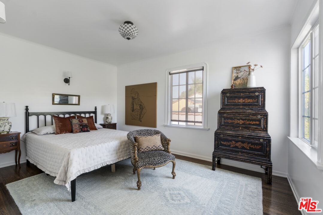 Set far back from the street in the coveted Brookside neighborhood, this enchanting Spanish Colonial offers a peaceful retreat in the heart of the city. A serene front courtyard welcomes you through the gate, setting the tone for the home's timeless charm. Inside, cathedral ceilings and hardwood floors create an airy, elegant atmosphere. The living room is anchored by a fireplace and a grand arched picture window that fills the space with natural light, while classic archways and Spanish detailing add warmth and character. The remodeled kitchen blends beauty and function with custom wood cabinetry, granite countertops, stainless steel appliances, custom lighting, and a beverage cooler. A charming breakfast room offers space for casual dining or a work-from-home nook, while the formal dining room is perfect for gatherings. The main level also includes a bedroom, a full bath, and a laundry room. Upstairs, two additional bedrooms and a spacious primary suite provide a quiet retreat. The primary suite opens to a second-floor balcony overlooking the courtyard, an inviting spot for morning coffee or evening relaxation. The private backyard offers flexible outdoor space for dining, gardening, or entertaining. A detached two-car garage and extended driveway provide convenient off-street parking. Recent upgrades include a relined sewer line, a new sewer line in the courtyard, a new HVAC system, new gutters, and a new water heater. Ideally located in Brookside, between Larchmont Village and The Grove, this home is just minutes from local eateries along La Brea and Wilshire like Republique, Apollonia's Pizzeria, Met Him At A Bar, Met Her At A Bar, The Night We Met, and All Seasons Brewery. Enjoy the newest Pickleball courts at Pikl, the historic El Rey Theatre, and The Ebell, making this one of Los Angeles' most vibrant and desirable neighborhoods.