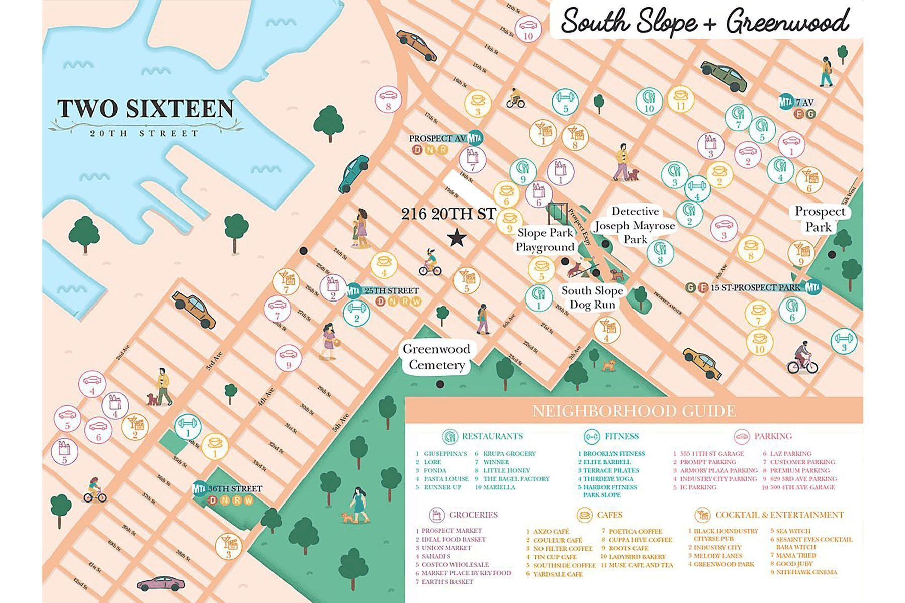 Ideally located between South Slope and Greenwood, Two Sixteen 20th offers a rare blend of neighborhood charm and urban convenience. Enjoy the vibrant dining of 5th Avenue, Nitehawk Cinema, and the green expanses of Prospect Park and Greenwood Cemetery—all within reach. Commute effortlessly via nearby R, F, and G trains, Citibike stations, and multiple parking garages.