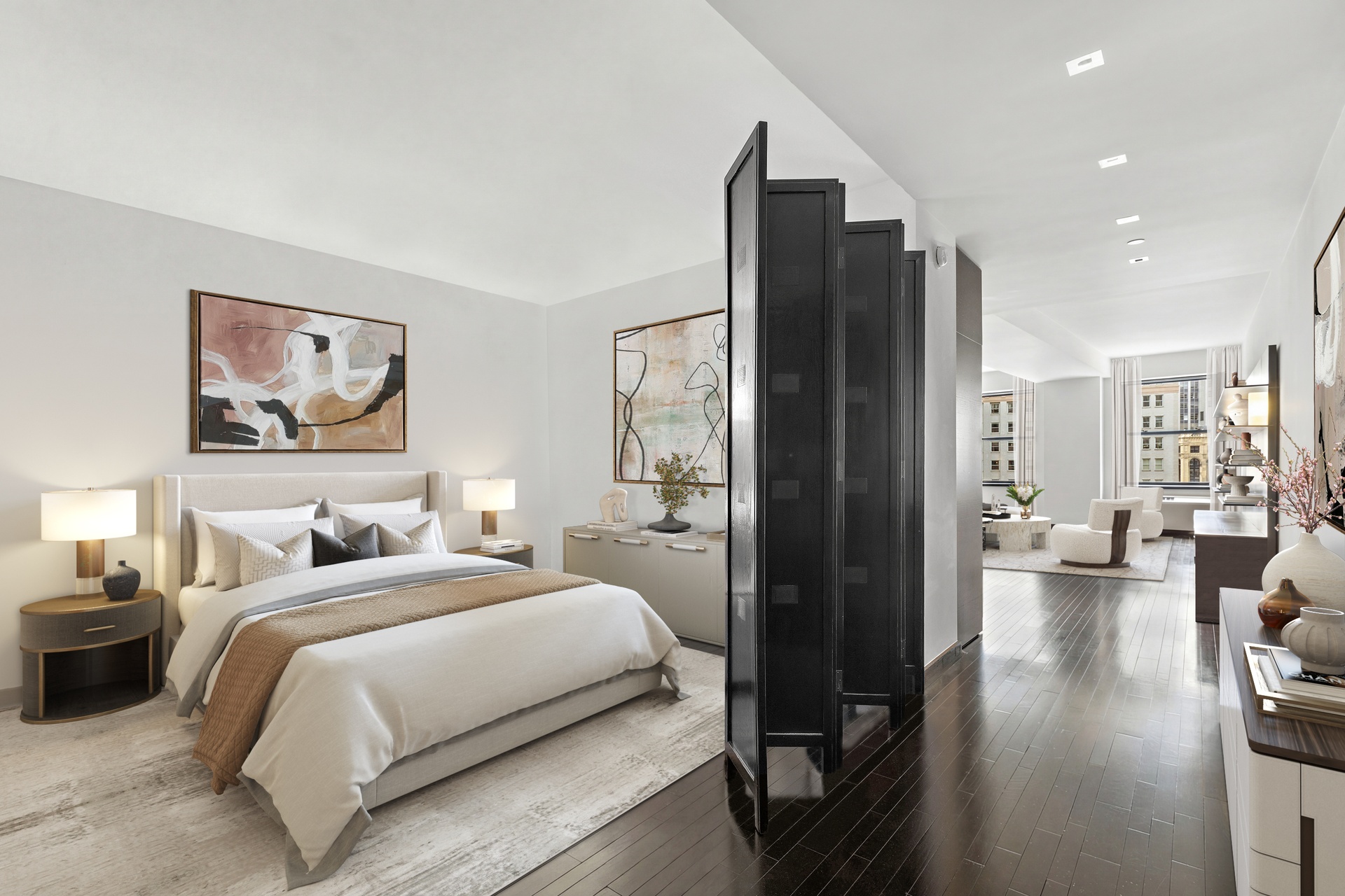 The great room is genuinely large and flexible for living, dining, and work-from-home. The bedroom is in the back of the apartment — quiet and separate from the rest of the space. There are two walk-in closets, as well as a spacious bathroom with both a soaking tub and rain shower.
