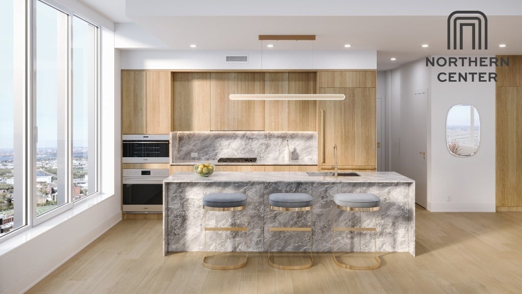 Northern Center offers more than 130 meticulously designed residences ranging from studio, one to three bedrooms. Upon entering, the 9'-5"+ ceiling heights and expansive windows fill the rooms with natural light, creating a spacious environment. Deep balconies provide spectacular panoramic views of the New York City skyline. Inside the residences there is a harmonious blend of refinement and functionality. Five-inch white oak floors add timeless sophistication and a warm ambiance to the living spaces. The kitchens feature sleek and modern design with ample quartz-stone countertops and backsplashes. Premium Bosch appliances seamlessly integrate into oak veneer cabinets.