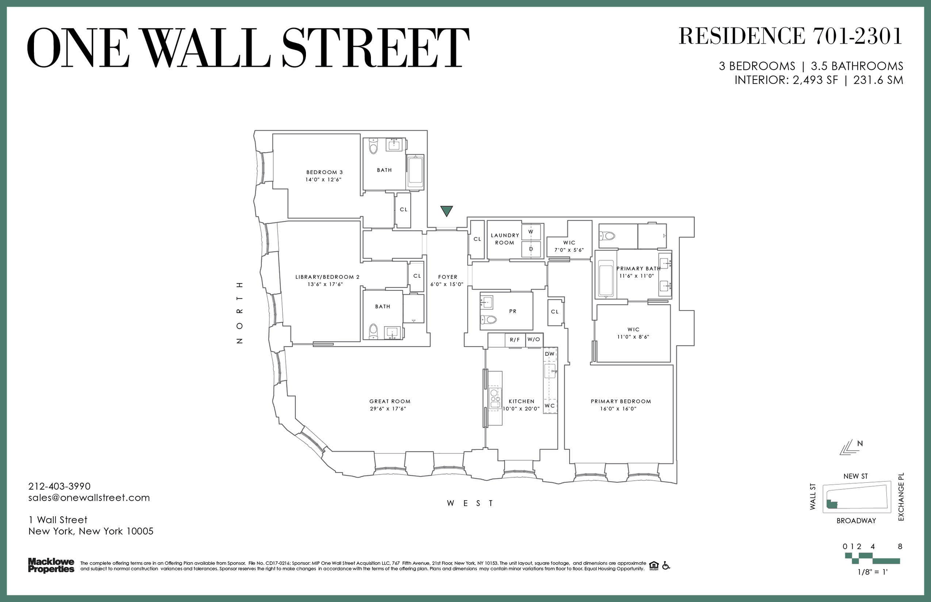 Residence 1801 is a 2,493-square-foot, three-bedroom, three-and-a-half-bathroom corner residence at One Wall Street. Positioned on the coveted north and west corner of the building, this exceptional home is bathed in natural light and framed by treelined views overlooking Trinity Church and Downtown Manhattan.