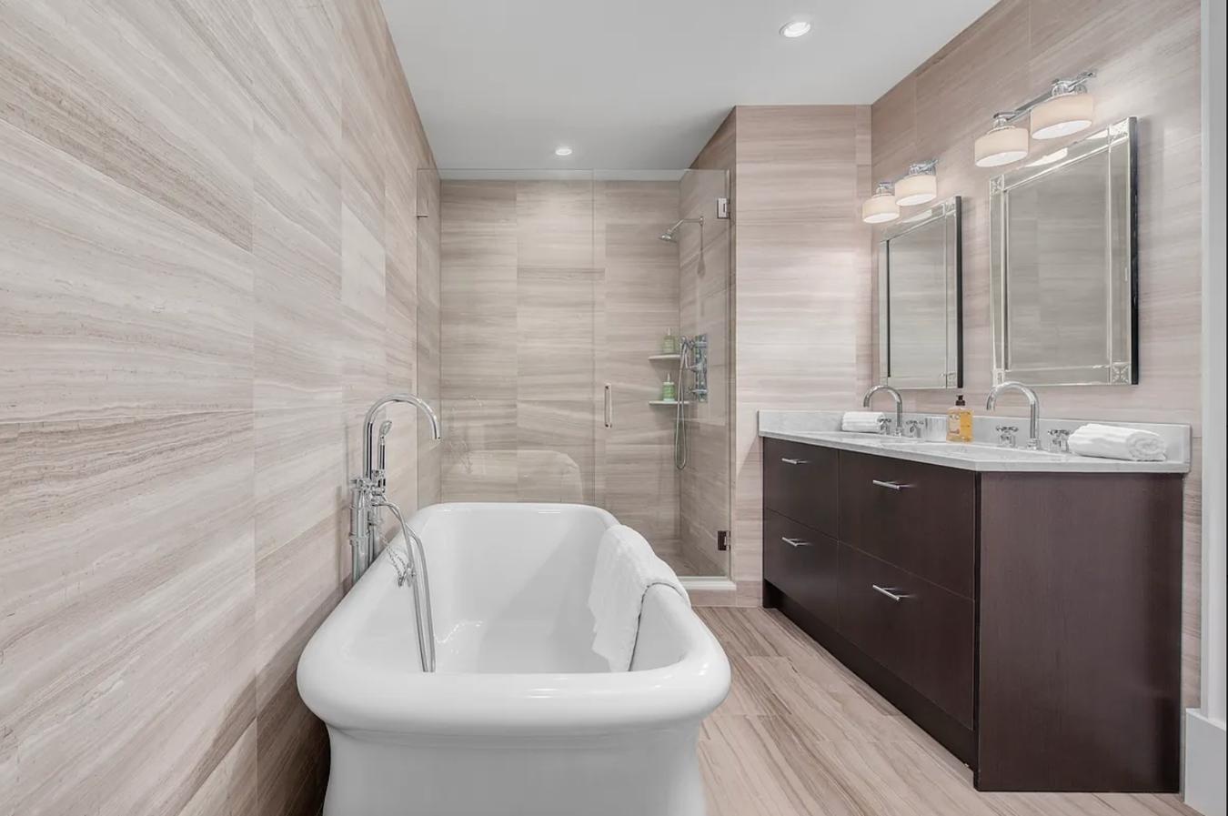 Retreat upstairs to a private oasis in the south-facing master bedroom suite on the second floor of the PH duplex outfitted with a second gas fireplace, two large walk-in closets and a luxurious five fixture en-suite marble tiled bath with Waterworks fixtures, a deep soaking tub and radiant heat floors. Two additional bedrooms, a second full bathroom and in unit Washer/Dryer are conveniently located on the upper floor.