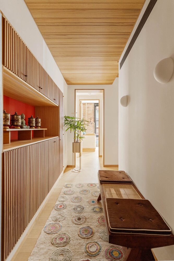 Throughout the home, French oak flooring and ceilings, bespoke millwork, and custom cabinetry and doors underscore the level of craftsmanship. A dedicated office off the primary suite, abundant storage, and a discreet laundry area further enhance functionality. The apartment is professionally soundproofed, significantly dampening sound transmission from above and below, creating a notably quiet living environment.