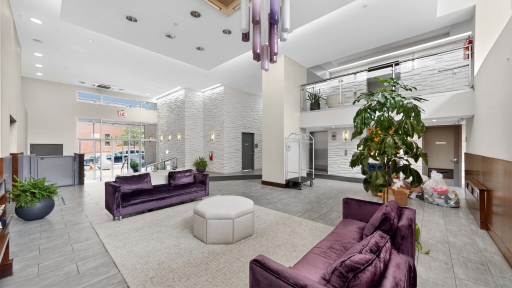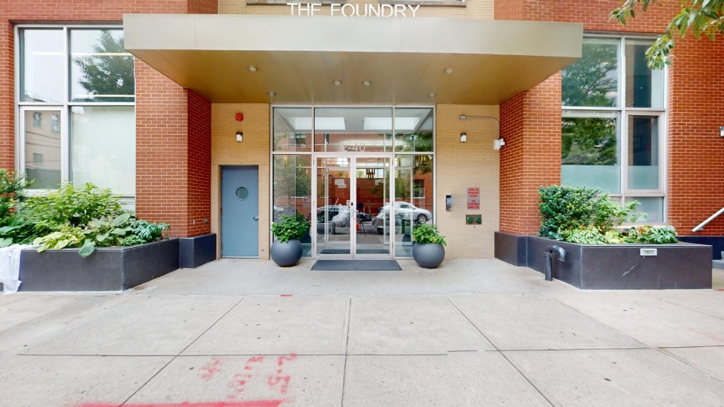 The Foundry offers a full suite of amenities, including a dramatic double-height lobby, an on-site resident manager, a package room, a fitness center, bicycle storage, and a large outdoor terrace with a dog run.