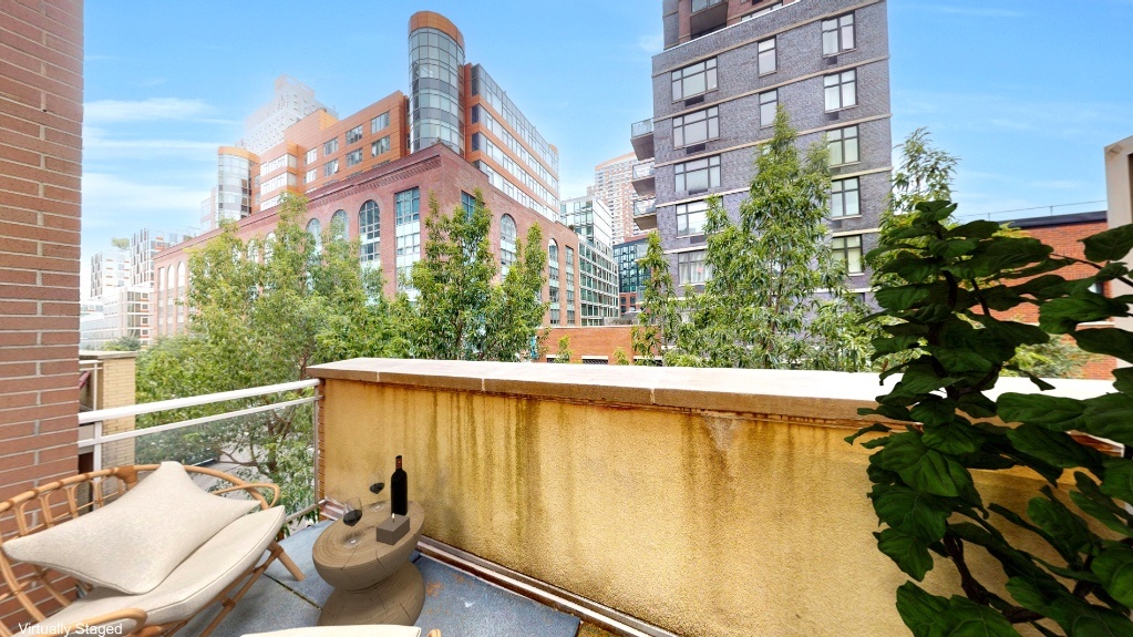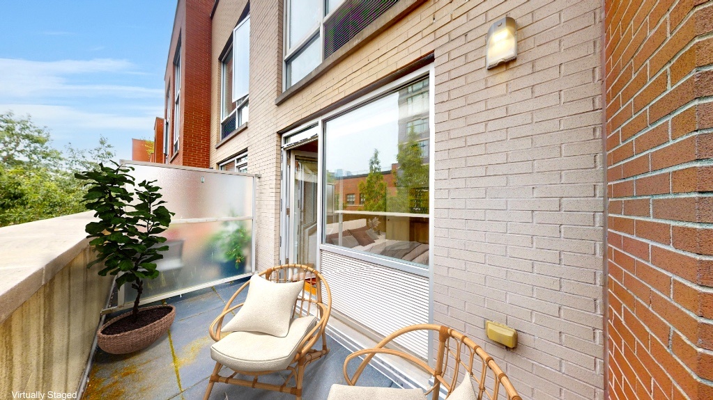 The residence features a private balcony with ample space to comfortably accommodate a table and chairs. It is perfect for enjoying breakfast, morning coffee, or a relaxing break on a beautiful day. Both the living area and the balcony offer peaceful views of the tree-lined street below, providing a rare sense of calm and privacy in the city.