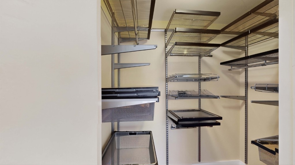 The spacious primary bedroom easily accommodates a king-size bed and includes a walk-in closet, offering generous storage.