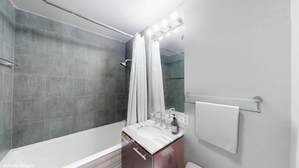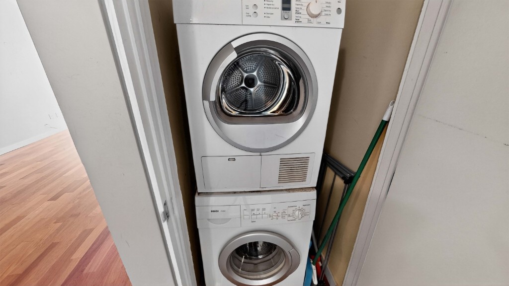 The spa-inspired bathroom features clean, modern finishes and a deep soaking tub with a shower combination. An in-unit washer and dryer add everyday convenience.