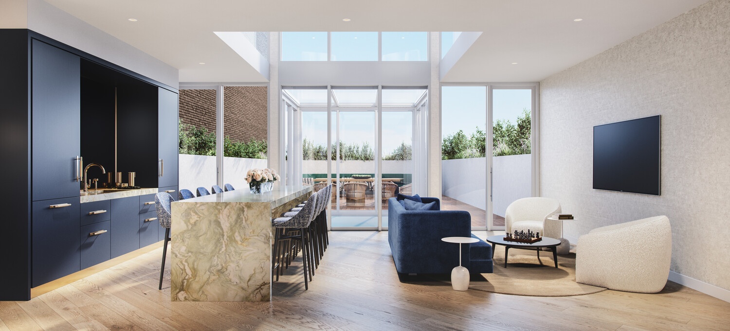 A modern reflection on timeless uptown elegance, 300 West honors the traditional architecture of Harlem with a contemporary twist. Rising fifteen stories and spanning a prime corner block in historic West Harlem, this collection of bespoke residences offers an elevated lifestyle. Complete with multiple floors of amenities including a pool and sauna, a 3,000 square foot roof deck, adjoining lounge and courtyard, and children and teen rooms, 300 West is perfectly suited for relaxation and rejuvenation. Celebrated interior designer Paris Forino brings her signature touch to the residences, balancing flow, utility, and sumptuous materials, to create spaces that project a refined calm.