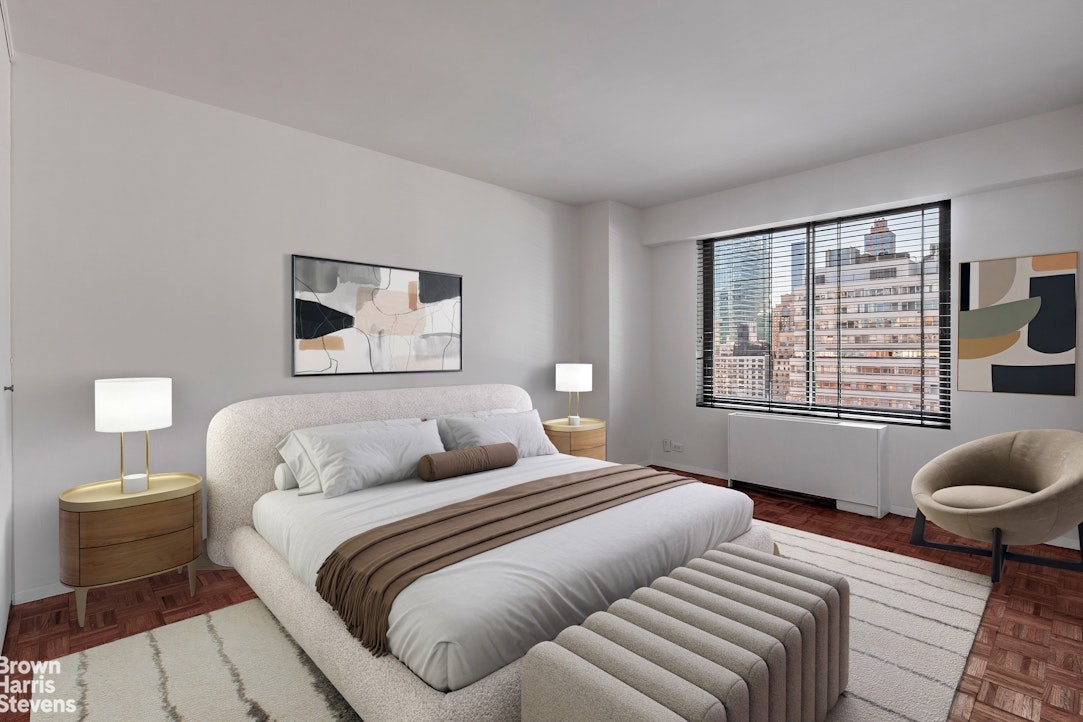 The apartment features a large living room and dining area with floor to ceiling windows accentuating the open views east to the 59th Street Bridge, South and west, and a corner balcony at the side of the living room. You enter the apartment with powder room with linen closet off the entry and a very large coat closet. Proceed down the hallway to a large pantry closet. Outside the separate kitchen is the dining area. Note the floor plan shows how the kitchen wall can be opened up. The very large bedroom faces south and has an entire wall of closets, including one walk-in. The bedroom has a marble en-suite bath. The apartment has nicely stained parquet floors. The Savoy features excellent amenities, including 24-hour doorman/concierge service, dry cleaning valet service, a newly renovated residents lounge and party room, newly renovated fitness center, landscaped sundeck, newly renovated hallways, a garage and housekeeping service is also available. Pets OK. W/D OK. Reserve Replacement Fund $235/month