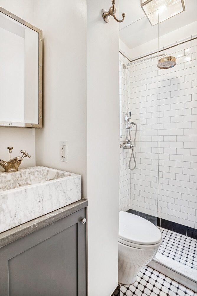 The windowed bathroom is wrapped in classic subway tile and features a marble-topped custom vanity and a Lefroy Brooks-appointed standing shower. A sturdy sliding door leads to the tranquil bedroom, where a west-facing window brings in warm afternoon light. The room comfortably accommodates a queen-sized bed with a nightstand and serves as a calm retreat in the center of SoHo.