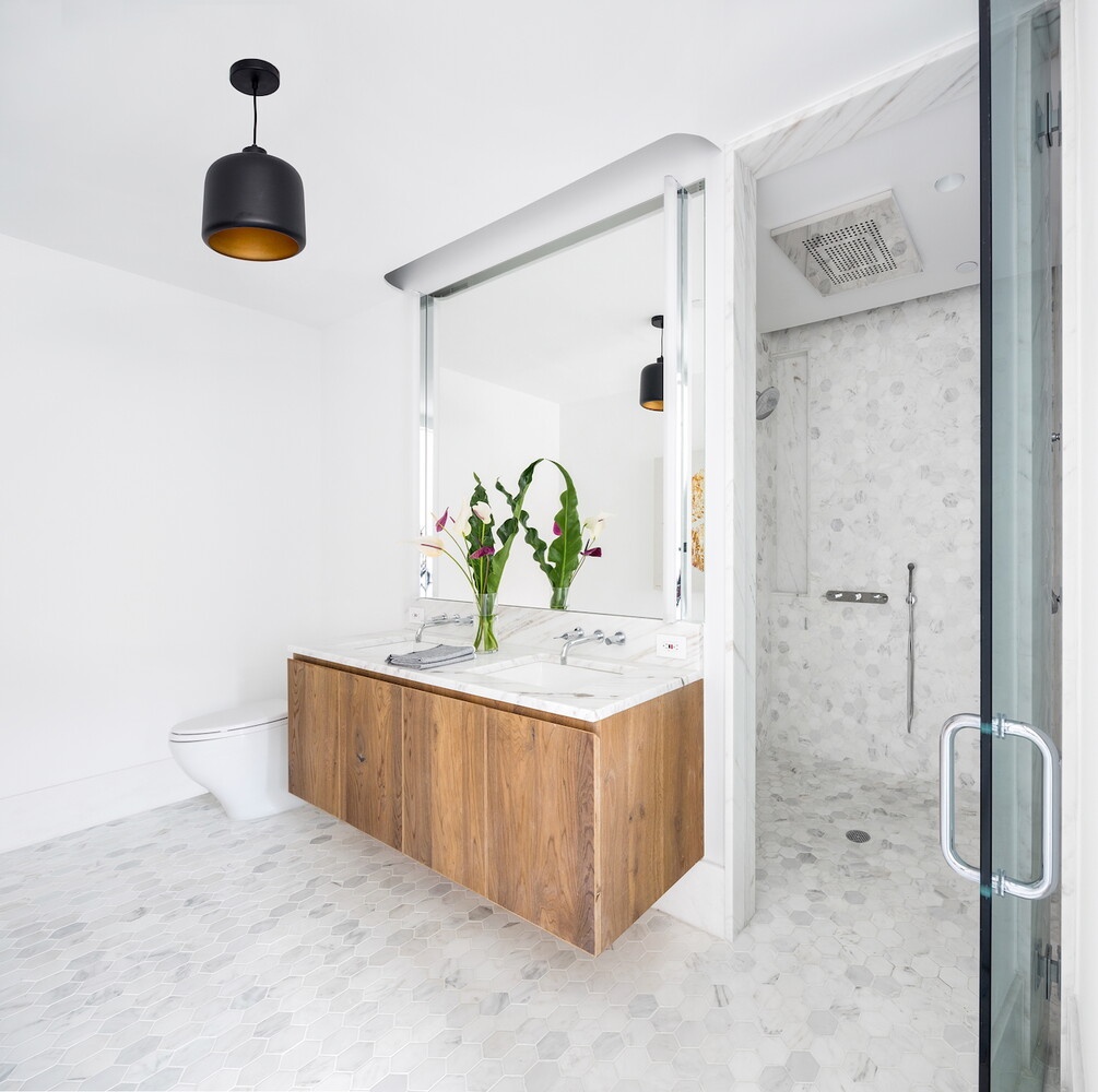 The large Primary Bedroom Suite features spacious closets and en-suite bath, with details including honed Bianco Oro marble stone top vanity with custom-designed Austrian oak cabinetry, La Cava sink with DaVinci fixtures in polished chrome, both rain shower and hand shower in polished chrome and a Toto dual-flush water closet.