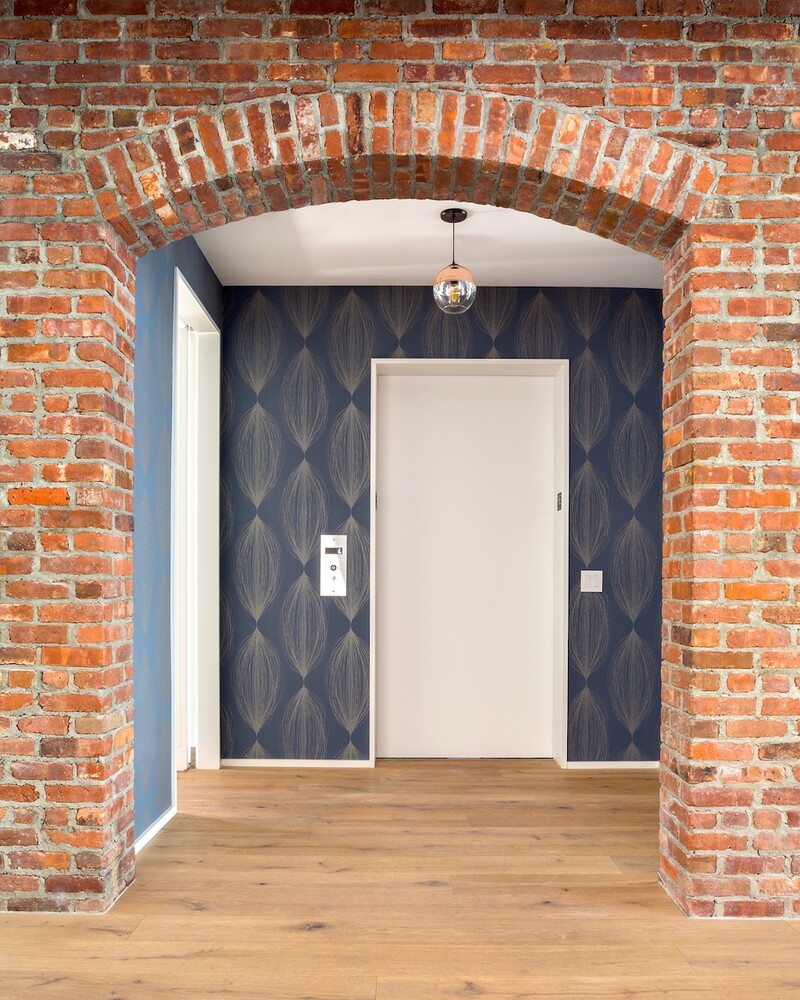 There is a separate den/flex bedroom with an exposed brick wall and en-suite bath clad in Ann Sacks ceramic penny tile, Hansgrohe shower, Clarke bathtub, Hansgrohe fixtures in polished chrome throughout, a Robern mirrored medicine cabinet, and a Toto dual-flush water closet.