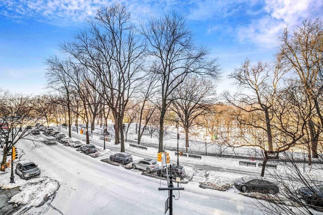 A separate bedroom wing offers a serene retreat. The primary suite enjoys an en-suite bath and stunning views of Riverside Park and the Hudson River through oversized picture windows. The second bedroom shares these vistas, while the third bedroom boasts generous proportions and access to a windowed shared bath.