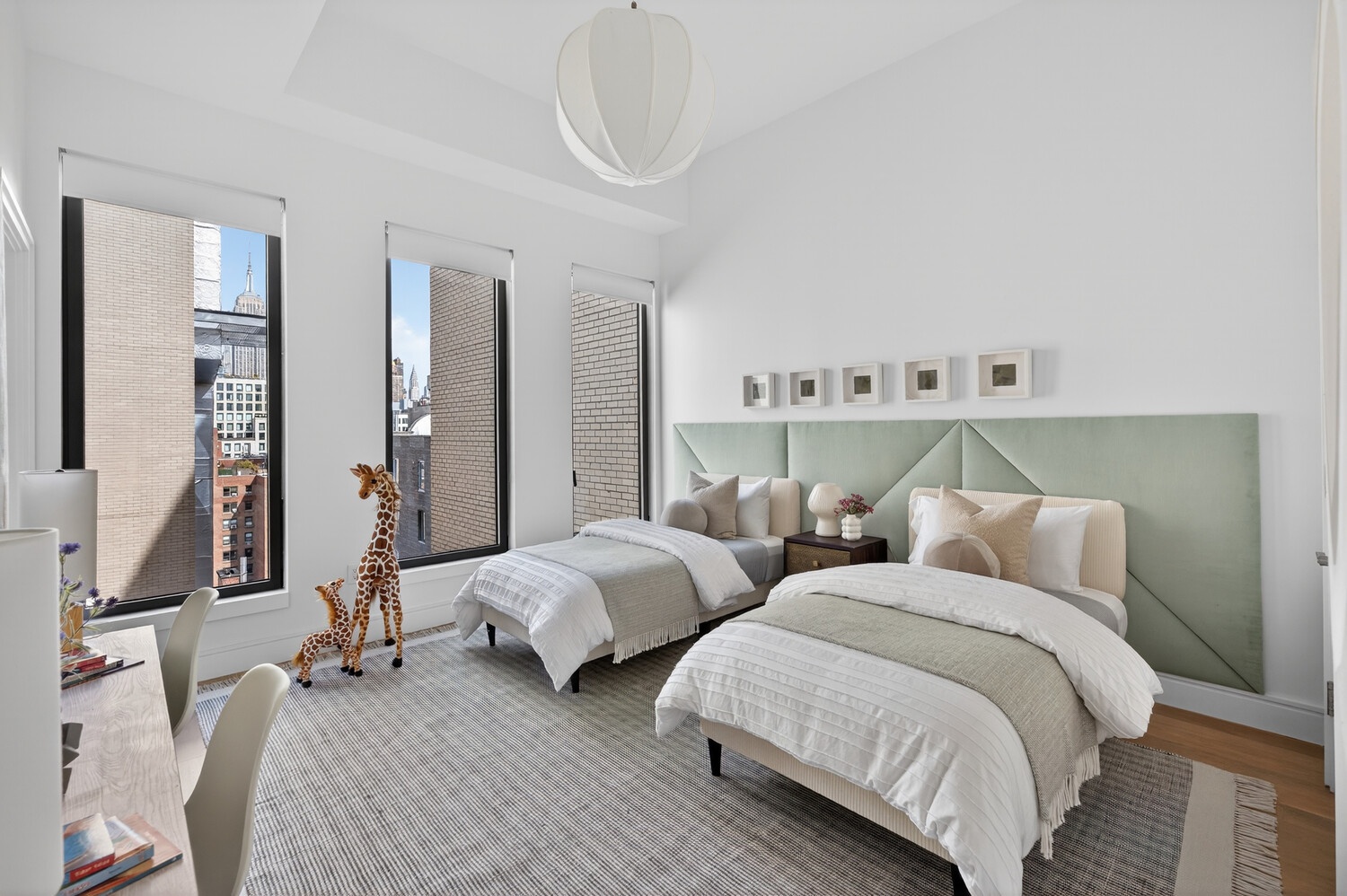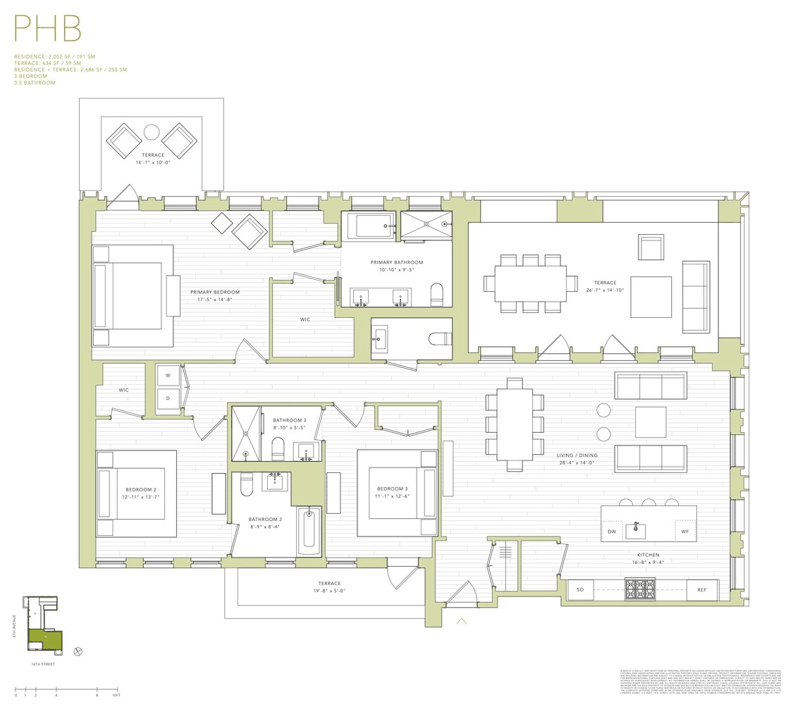 Presenting PHB: a premier 3-bedroom, 3 and-one-half-bathroom residence offering 634 feet of private outdoor space across three expansive terraces. With incredible exposures to the North, South, and West, this gracious 2,052 square foot home boasts ceiling heights up to 13'1", 5" white oak flooring throughout, and oversized tilt-and-turn windows with enhanced noise reduction that are pre-wired for window treatments.