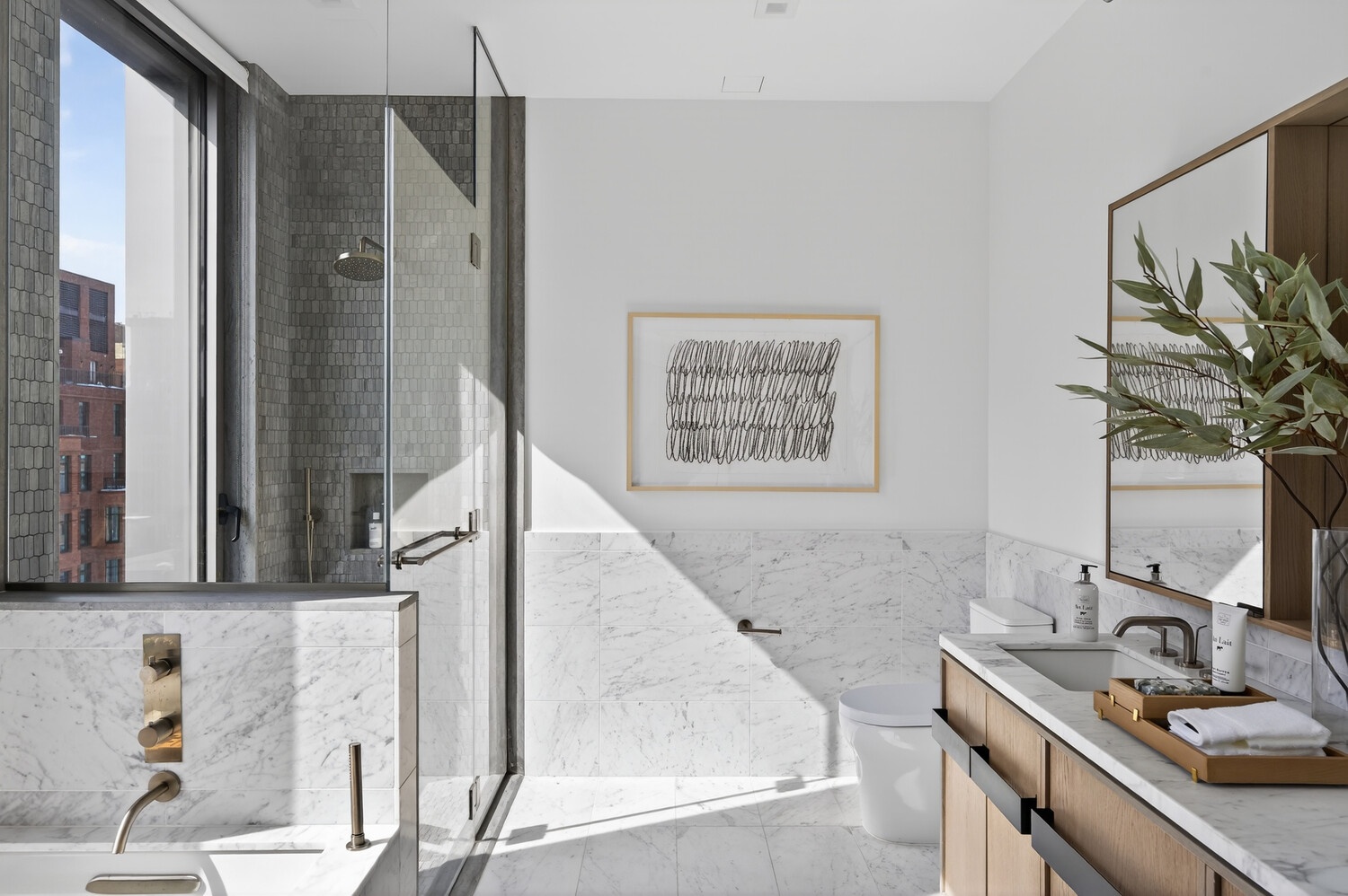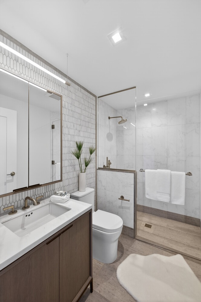 The luxurious primary bedroom suite offers oversized windows and a separate private terrace, creating a truly serene retreat. The oversized primary and secondary closets provide ample storage. Sheathed in Calacatta Regina marble, the spa-like en-suite primary bathroom features a custom Morris Adjmi-designed oak vanity with dual undermount porcelain sinks with brushed nickel fixtures. Accents of Montagna D'Argento marble and a custom oak framed medicine cabinet complete this elegant experience.