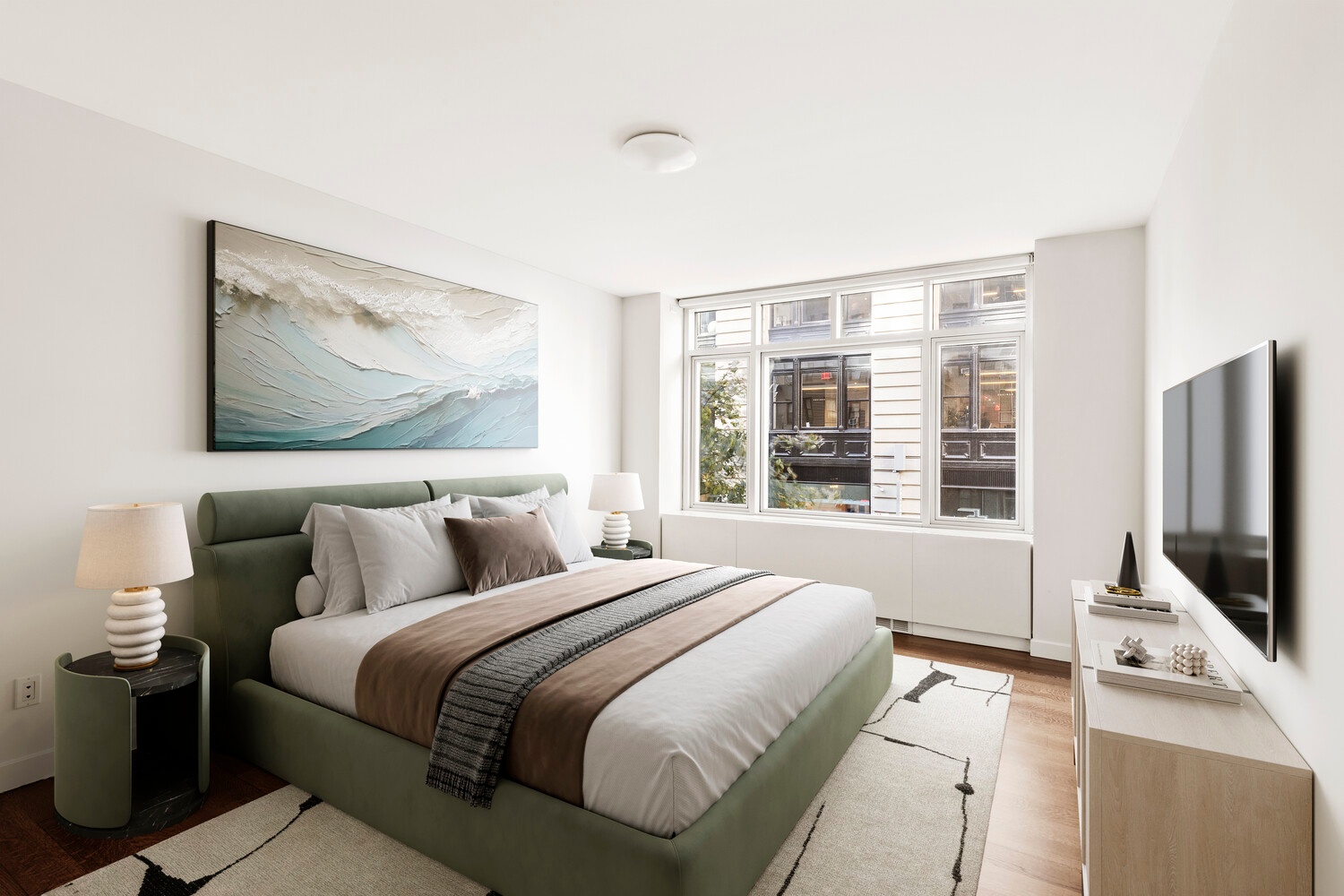 Experience elevated city living in this impeccably designed two-bedroom condominium offering 1,316 square feet of refined interiors. This move-in-ready residence feels even more expansive thanks to soaring ceilings and oversized, wall-to-wall windows that flood the open layout with southern light and iconic New York City views. Wide-plank hardwood floors add warmth and continuity throughout the living, dining, and kitchen spaces, creating a seamless and sophisticated home for both everyday living and entertaining.