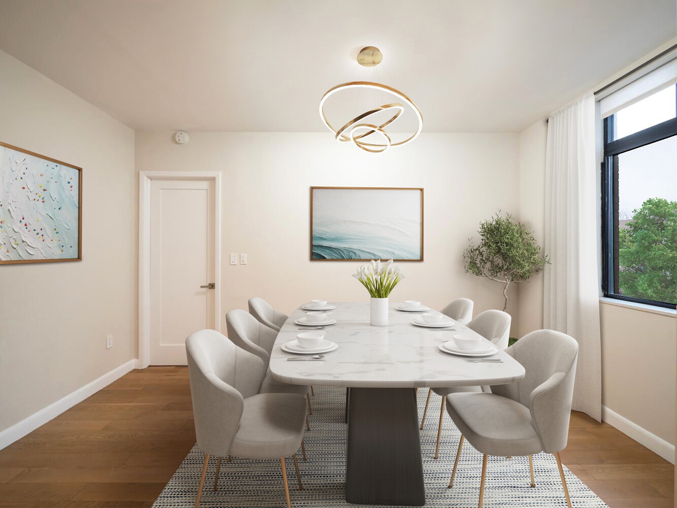 The north-facing great room, currently configured as a grand living and formal dining space, features four large windows and a glimpse of the Hudson River. It is an ideal setting for both everyday living and entertaining.