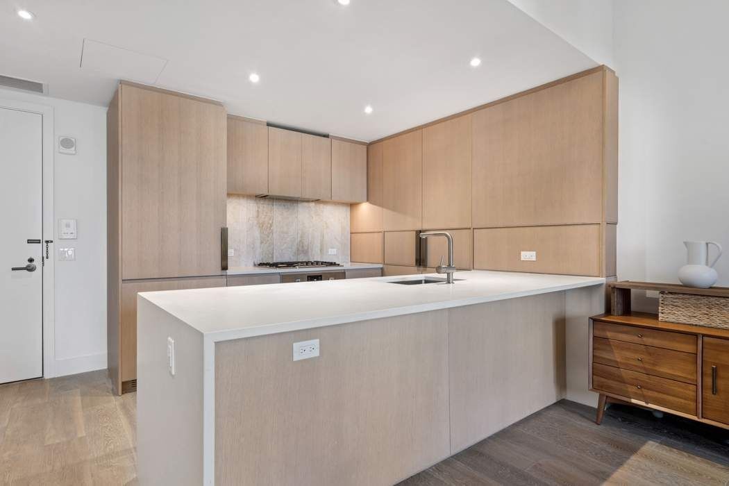 Apartment 9A two-bedroom, and two baths residence designed by ODA New York. The custom kitchen features rift oak cabinetry strikes a distinct contrast against the concrete-hued Caesarstone countertop, Taj Mahal stone backsplash, and antique brass hardware, top-of-line appliances including fully paneled Bosch refrigerator, Bosch microwave, Bosch dishwasher, a stainless steel Bosch range, a Marvel wine refrigerator, and an under-mount deep sink. The well-proportioned master bedroom fits king size bed. The master bathroom features two types of marble and stone mingling to create a neutral palette. A composition of Santa Marina stone tile walls, Waterworks fixtures, and oak vanity with Fior di Bosco countertops complete the bath. Apartment features are wide plank oak floors and a Bosch washer and dryer. Additionally, a storage unit is included.