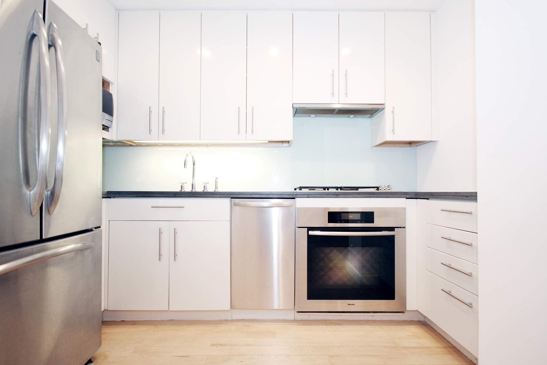 The kitchen is outfitted with stainless steel Miele appliances, Knoll cabinetry, and high-end fixtures, designed to integrate seamlessly with the living space. A brand new Bosch washer and dryer are located within the apartment, and newly upgraded PTAC units with individual climate controls allow for customized comfort throughout. A separate large basement storage unit is included.