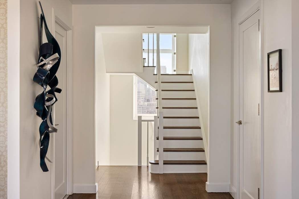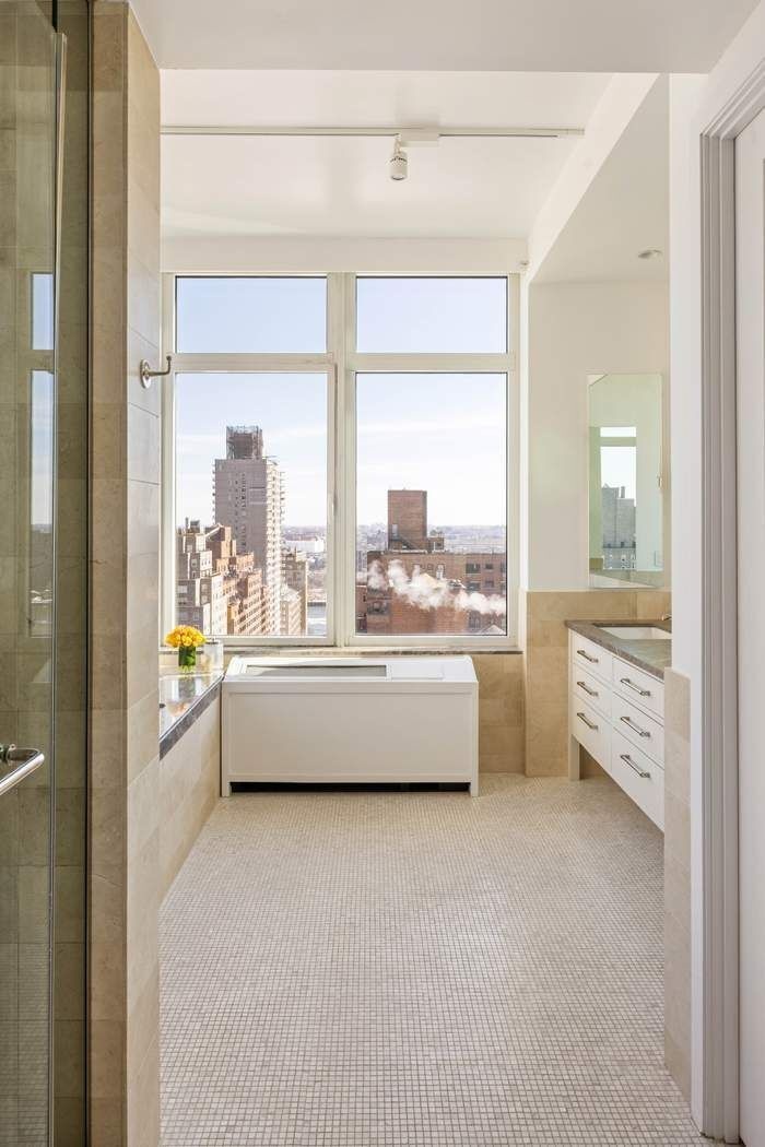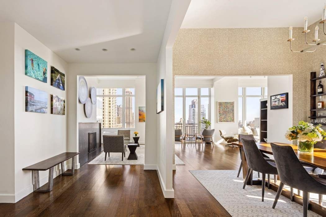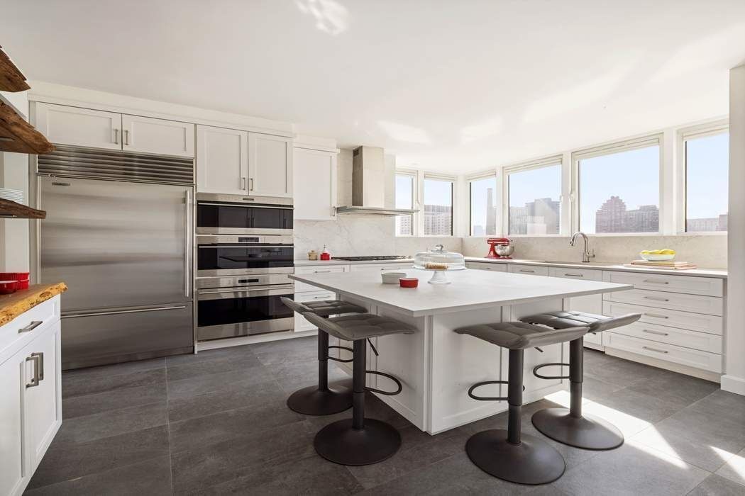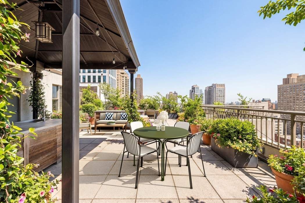 Welcome home to this stunning light-filled sanctuary, a magnificent 3,562 square foot duplex penthouse with an additional 1,000 square foot private rooftop terrace ideally situated in the Arcadia, one of the Upper East Side's premier full-service condominiums. Defined by sundrenched and expansive interior spaces, soaring 12-foot ceilings, and dramatic skyline views to the north, south, and east, this sophisticated 5-bedroom, 5.5-bathroom home in the sky has been masterfully designed both for versatile everyday living and elegant entertaining. Enter from the semi-private elevator landing into the loft-like living and dining spaces bathed in extraordinary natural light through walls of showstopping floor-to-ceiling windows. The double corner living room with sweeping views and a stately gas fireplace allows for multiple seating arrangements and flows wonderfully into the large dining room with East River views. Adjacent to the dining room and connected through a wet bar/coffee station, the recently renovated kitchen is flooded with light all day long. Certain to delight the most discerning chef, the kitchen is fitted with custom cabinetry, stone countertops, a center island with seating for four, and premium appliances including Sub-Zero refrigerator and wine cooler, Miele dishwasher, three wall-mounted Wolf ovens (including a steam convection oven and microwave), and Wolf cooktop with vented hood. A south-facing library/media room with ensuite bathroom (which could easily function as a 5th bedroom) and a lovely powder room for guests complete the upper level.