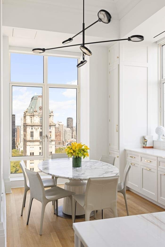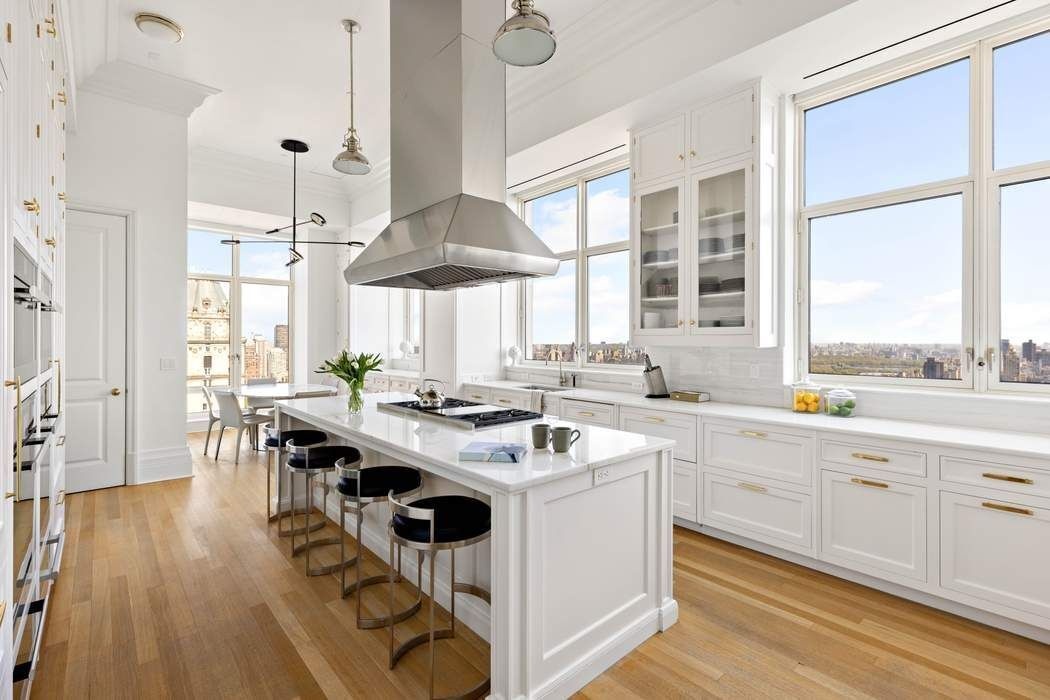 Enter from your private key-locked elevator landing through stately double doors into an impressive gallery from which all interconnected entertaining spaces graciously flow. Experience the magic of New York City from sunrise to sunset from the grand corner living room, featuring breathtaking views of Central Park, the Madison Historic District, and the East River through walls of expansive windows. Separated by oversized pocket doors, the living room opens into the spacious formal dining room (currently utilized as a second living room) with more sweeping views. Adjacent to the living room is an intimate media room/library which could easily function as a 4th bedroom with its gorgeous ensuite marble bathroom. The spectacular windowed eat-in-kitchen overlooking Central Park is outfitted in custom Christopher Peacock cabinetry and hand painted cabinets with hand-blown glass. The best-in-class appliance package boasts a Subzero refrigerator with two freezer drawers, two additional separate refrigeration drawers, a six-burner plus skillet Wolf range with vented hood, two Miele dishwashers, multiple Wolf wall ovens, built-in below-cabinet Wolf microwave, and a full-height Sub Zero wine refrigerator. Enjoy your morning coffee from the beautiful island cloaked in marble or in the breakfast nook with mesmerizing views west through floor-to-ceiling windows.