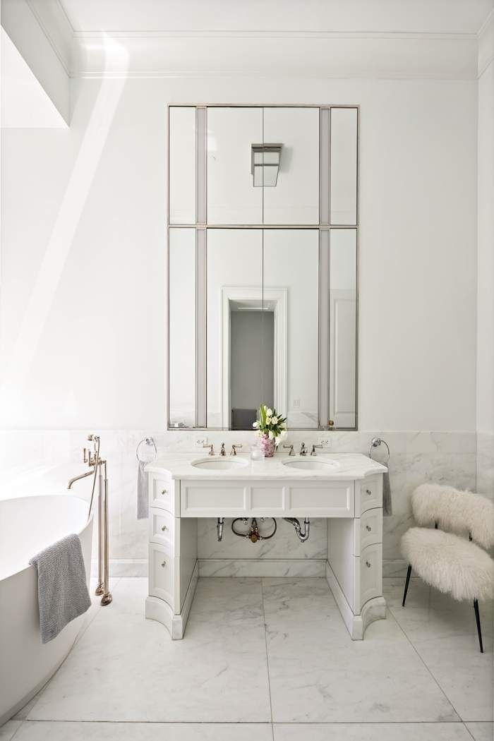 The luxurious corner primary bedroom suite boasts sunlit south and east exposures with incredible views of the Empire State and Chrysler Buildings, four closets, two of which are custom-outfitted walk-in-closets, and a spa-like windowed bathroom with Victoria Albert free-standing bathtub, separate steam shower, radiant heated floors, stunning marble slabs and fixtures, and a custom-designed double vanity. A second private bedroom corridor separates the second- and third-bedroom suites from the public rooms and contains the in-unit laundry, featuring an Electrolux washer and vented dryer. Both bedrooms enjoy natural light pouring through southern and western windows, an abundance of closet space, and ensuite marble bathrooms, one with a tub and the other with a glass stall shower.