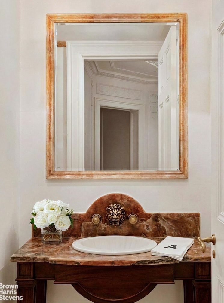 A dramatic, formal foyer greets you and your guests with a soaring ceiling, original lighting fixtures, bespoke moldings, and floors. The powder room off the entrance foyer features an elegant antique vanity and lighting, completing this drop-dead gorgeous entrance.
