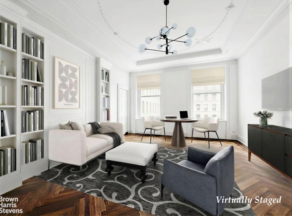 Oversized windows fill the space with natural light and offer views of the Apthorp Courtyard and West End Avenue, creating a peaceful and inviting atmosphere.