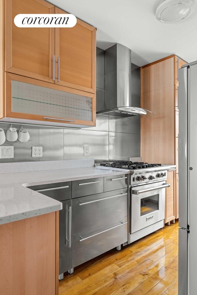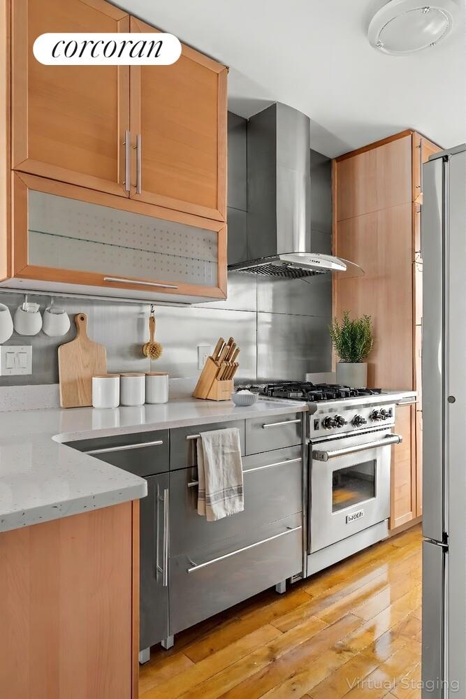 Unit boasts an open-concept living area with a thoughtfully updated kitchen featuring high-end appliances, sleek modern finishes, and excellent storage.