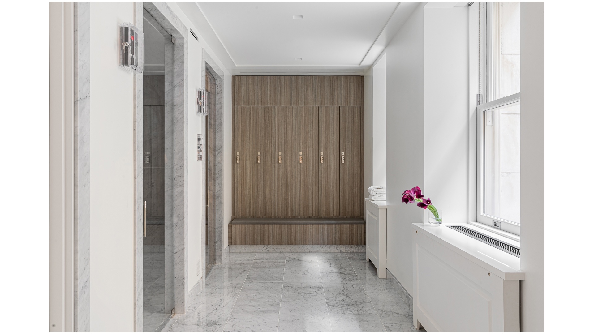 The serene primary suite overlooks the quiet courtyard and offers generous closet space along with a luxurious, windowed spa-style bathroom. Finished in striking Siberian white slab marble, the bathroom features radiant heated floors, a deep soaking tub, and custom vanities with fixtures by Kohler, Dornbracht, and Kallista, creating a true retreat within the home. Two additional bedrooms are equally refined, each with beautifully appointed en-suite bathrooms finished with Grigio Nicola stone, radiant heated floors, and Molteni-designed vanities.