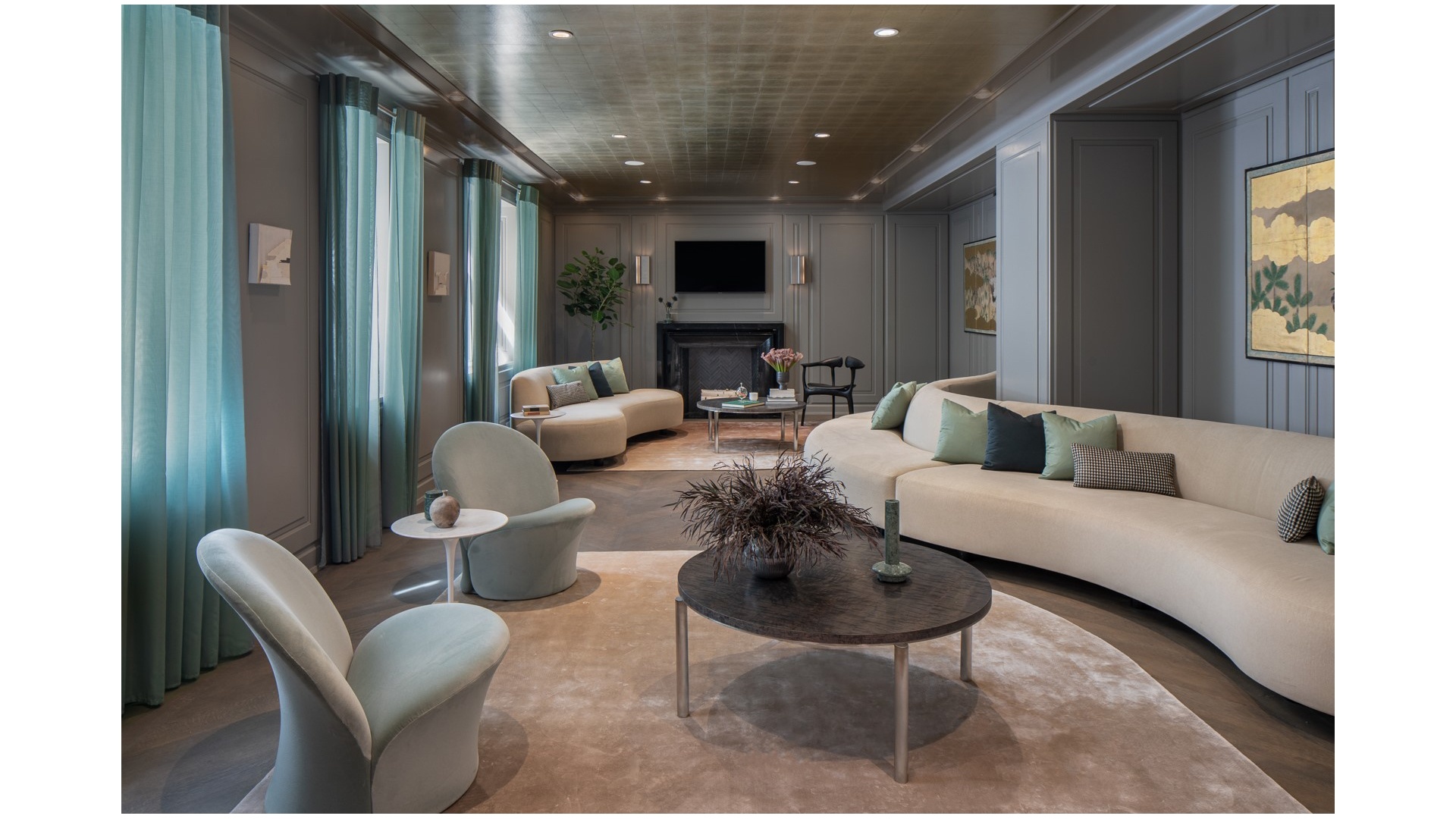 A gracious entry foyer and gallery welcome you inside and lead to a spectacular great room, perfectly suited for everyday living, dining, and entertaining. Just beyond, the custom Molteni kitchen is designed for both style and function, showcasing Calacatta Gold marble countertops and backsplash, cerused oak cabinetry, and top-of-the-line Gaggenau appliances. A 45-bottle Sub-Zero wine refrigerator completes this thoughtfully designed culinary space.