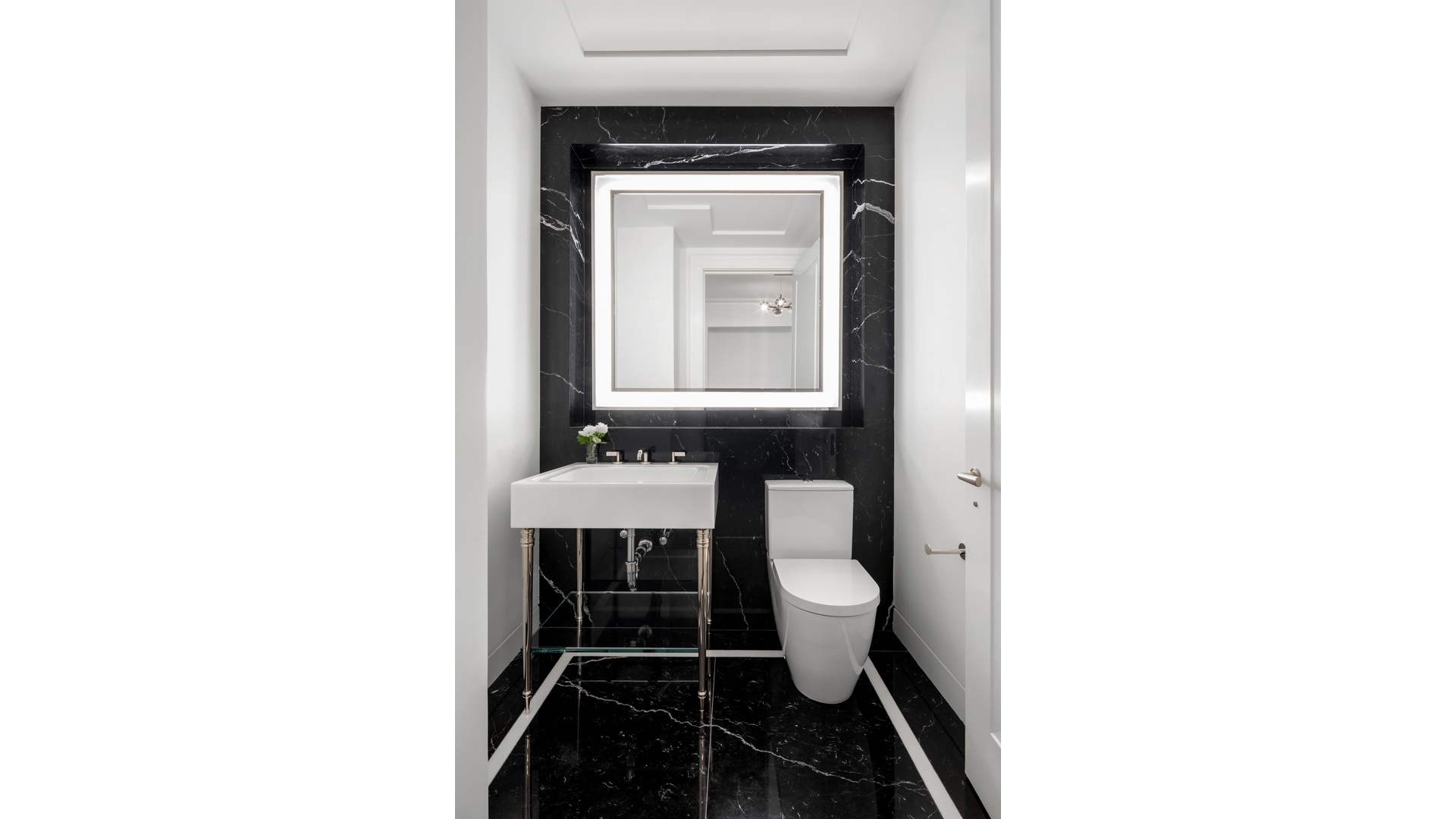 Located off the gallery, a distinctive powder room showcases polished Nero Marquina marble and a sculptural Snow White marble sink. Additional conveniences include a Whirlpool washer and dryer, a high-performance VRF dedicated HVAC system, and integrated Intrahome technology infrastructure.